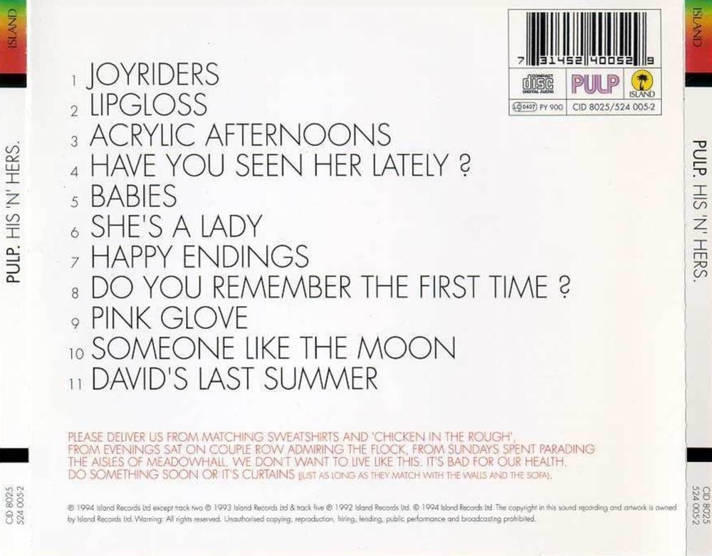 1994. Mε τον απόηχο του grunge και τον θάνατο του Kurt Cobain να σηματοδοτεί ουσιαστικά το τέλος του genre, άτυπα τη σκυτάλη του μουσικού γίγνεσθαι παίρνει η britpop. Η γνωστή αντιπαράθεση των δύο star bands του είδους, Oasis και Blur, ξεκινά αυτή τη χρονιά, με τους πρώτους να κυκλοφορούν το ντεμπούτο τους, "Definitely Maybe" και τους δεύτερους το "Parklife" και να κονταροχτυπιούνται για την κορυφή. Κάπου εκεί, στριμώχνεται και η κυκλοφορία του "Ηis 'n' Hers", με τους Pulp να φαίνεται να είναι η μπάντα που ακολουθεί μετά τη προαναφερθείσα δυάδα, με τους μεν Oasis να αποτελούν τους working class εκπροσώπους του είδους και τους Blur την middle class έκφρασή του.