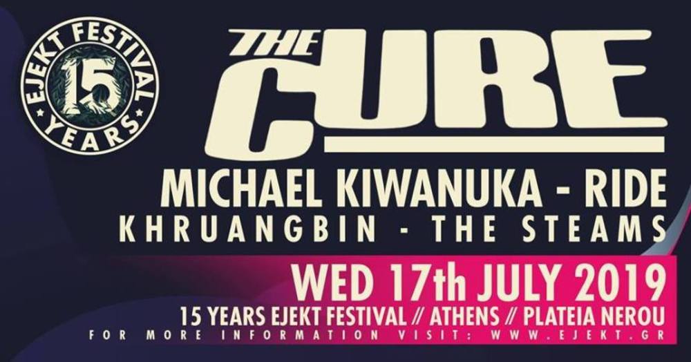 Το Ejekt φέτος γιορτάζει 15 χρόνια παρουσίας στα συναυλιακά δρώμενα της χώρας και αποφάσισε να κάνει μόνο μια φεστιβαλική μέρα στις 17/7, και τι μέρα… Όταν ανακοινώθηκε το περασμένο Χειμώνα ότι το καλοκαίρι θα εμφανιστούν στο Ejekt οι The Cure νομίζω δεν έβλεπα τίποτα άλλο στην αρχική μου σελίδα στο facebook για δυο-τρεις μέρες. Παροξυσμός από το μεγαλύτερο μέρος των Ελλήνων μουσικόφιλων, καθώς πρόκειται για μια μπάντα που λατρεύουν όλες οι ηλικίες. Κάτι που αποτυπώνεται και στην προπώληση των εισιτηρίων, αφού έχουν εξαντληθεί ήδη τα vip εισιτήρια καθώς και τα περισσότερα από τα υπόλοιπα. Πλέον μπορείτε να προμηθευτείτε όσα εισιτήρια έχουν απομείνει στην τιμή των 55 ευρώ. Τους The Cure θα πλαισιώσουν τα επίσης σούπερ ονόματα των Michael Kiwanuka, Ride, Khruangbin και οι The Steams.