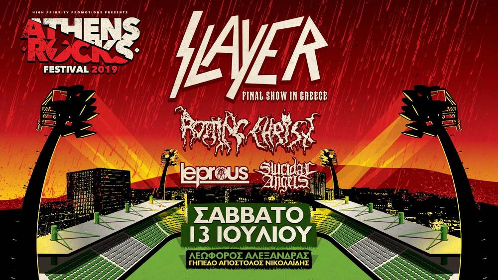 New entry στα μουσικά Φεστιβάλ της χώρας το Athensrocks και μπαίνει δυναμικότατα. Ξεκινάει με μόλις μια μέρα φέτος, αλλά σε αυτή την μέρα οι μεταλάδες -και όχι μόνο- της χώρας θα χάσουν 10 κιλά από τον ιδρώτα τους. Το Σάββατο 13 Ιουλίου το ελληνικό κοινό θα έχει την ευκαιρία να δει για τελευταία φορά τους θρυλικούς Slayer σε ένα ιστορικό μέρος, αυτό του γηπέδου της Λεωφόρου «Απόστολος Νικολαίδης». Οι μπάντες που θα έχουν την τιμή να αποχαιρετήσουν τους Slayer είναι οι τεράστιοι Rotting Christ, οι Suicidal Angels και οι Leprous. Βλέποντας τα ονόματα, ακόμα και αν δεν είσαι fan και γνώστης αυτής της σκηνής, καταλαβαίνεις πως όλοι τους θα μπορούσαν να είναι headliners σε πάρα πολλά φεστιβάλ. Τα μαγικά χαρτάκια ξεκινούν από τα 60,50 ευρώ και σίγουρα τα αξίζουν οι παραπάνω μπάντες.