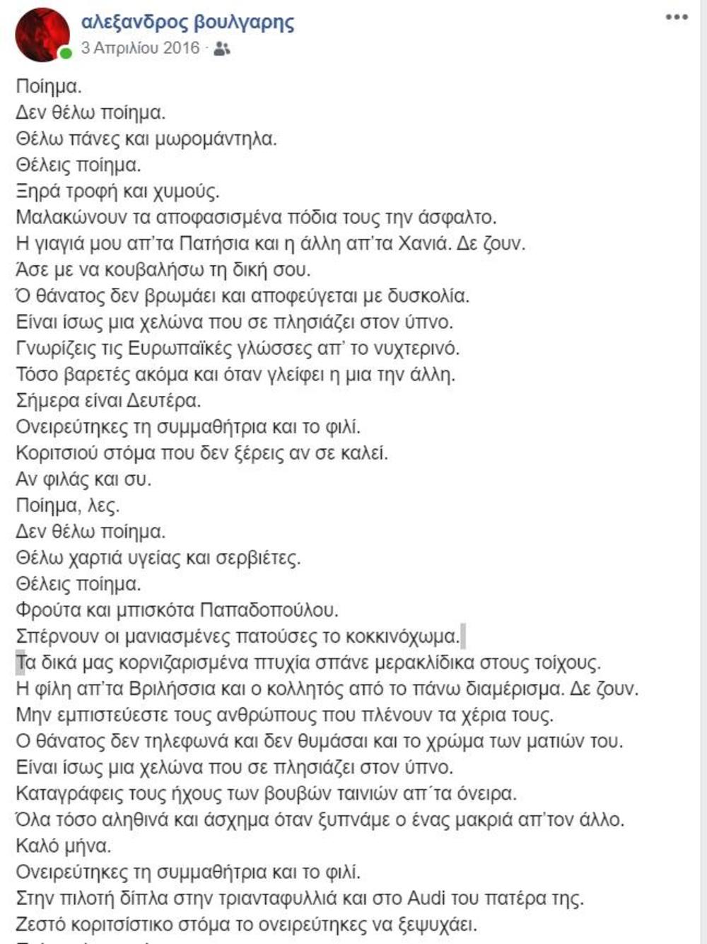 * Ψάχνοντας να βρω, δε θυμάμαι τι, για αυτό το άρθρο το τοίχο του Boy στο facebook έπεσα πάνω στο παρακάτω post. Το μόνο που μπορώ να σχολιάσω είναι ότι τις περισσότερες φορές δεν μπορείς να ξέρεις το γιατί και το πότε γράφει κάτι ο Αλέξανδρος. Τρια χρόνια πριν την κυκλοφορία του δίσκου, μας είχε ψιθυρίσει ήδη τους στίχους του "Θέλω Ποίημα"...