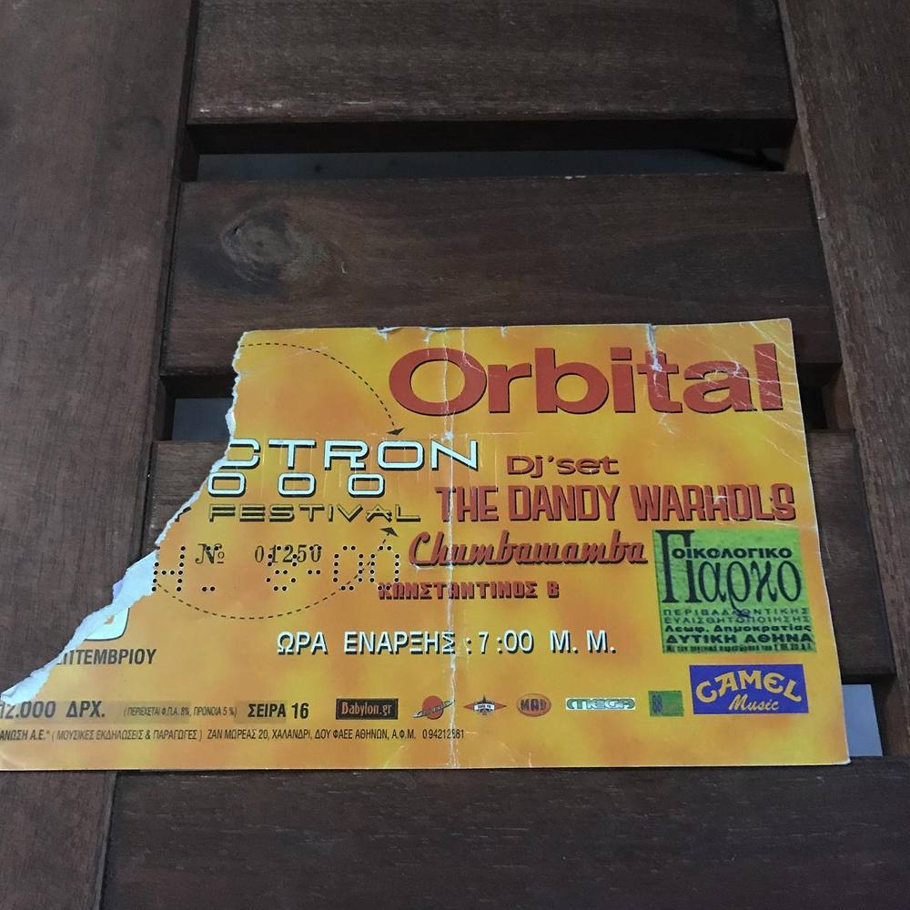 Orbital, The Dandy Warhols, Chumbawamba, Κ. Βητα. Electron Festival, Ελληνικό (και όχι Πάρκο Τρίτση που γράφει το εισιτήριο). Αφού πετάξαμε πέτρες στους Chumbawamba ως γνήσιοι κριτές των πάντων, είδαμε για πρώτη φορά τους Dandy Warhols στα καλύτερά τους και ακούσαμε επιτέλους και το Satan. Υπέροχα.