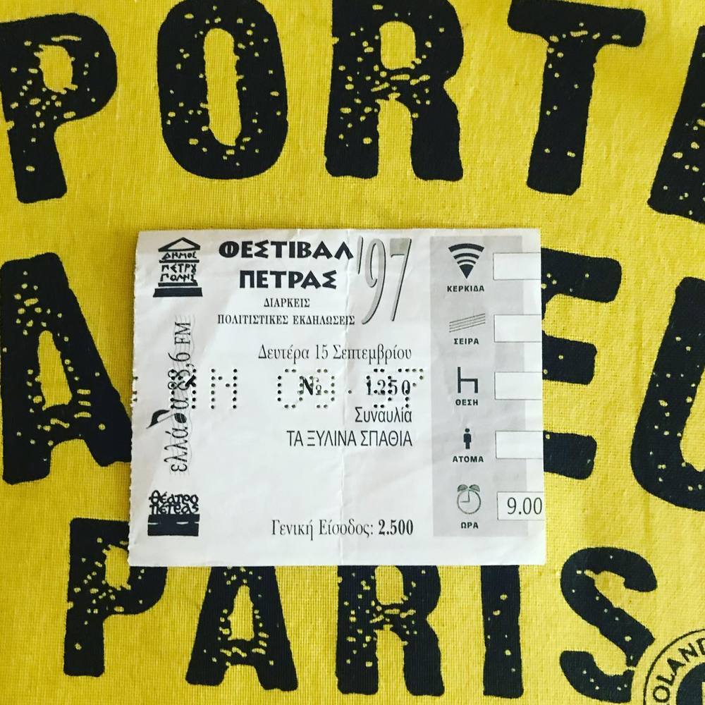 Τα Ξύλινα Σπαθιά, Θέατρο Πέτρας. Ωραίες εποχές, όταν για να βγουν για encore Τα Ξύλινα Σπαθιά από κάτω φωνάζανε “Ω, είναι ωραία στον παράδεισο” και βρίζανε τον ΠΑΟΚ και την Θεσσαλονίκη. Πολύ νορμάλ... Λίγο καιρό πριν είχε βγει το "Μια Ματιά Σαν Βροχή" και ήταν η περίοδος που Τα Σπαθιά ήταν συναυλιακά στα καλύτερά τους. Σε λίγους μήνες θα έφευγε ο Τόλιος και θα κάνανε ένα τεράστιο εμπορικό χαρακίρι στο Rockwave του 98. Ποιός να το περίμενε όταν ξεκινάγαμε από Νέα Σμύρνη για το live και φτάναμε μετά από μισή μέρα στην Πετρούπολη, ότι εγώ που έλεγα τότε δεν ξαναερχομαι ποτέ εδώ, θα ήμουν τώρα Πετρούπολη και θα πήγαινα Νέα Σμύρνη για να βλέπω τον Παυλίδη.