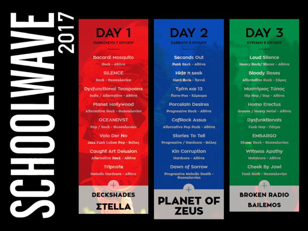 To Schoolwave Festival είναι ένας ετήσιος και σημαντικότατος μουσικός θεσμός μακροβιότερος από πολλούς άλλους στην χώρα μας που λαμβάνει χώρα στις αρχές του Ιουλίου, λίγο μετά τις εξετάσεις και λίγο πριν τα θερινά φροντιστήρια... Αν δε με απατά η μνήμη μου, έχω πάει τρεις φορές και είχα περάσει τέλεια και τις τρεις. Το φεστιβάλ μετράει 12 χρόνια ζωής, αρχής γενομένης από το 2005, και φέτος θα κλείσει τα 13. Για πρώτη φορά τη φετινή χρονιά χώρος συνάντησης θα είναι το ίδρυμα Σταύρος Νιάρχος για ένα γεμάτο και άκρως ενδιαφέρον μουσικό 3ημερο (7-8-9 Ιούλη). Τα προηγούμενα χρόνια το Schoolwave είχε στεγαστεί στην Τεχνόπολη (2005-2007), στην Πλατεία Νερού (2011 & 2014) και στο Θέατρο Βύρωνα (2007-2010, 2012-2013, 2015). Στην επικείμενη διοργάνωση θα πάρουν μέρος 24 μαθητικά και φοιτητικά συγκροτήματα (επιλέγονται ανάμεσα από περίπου 500 υποψηφίους!) και θα έχουν την ευκαιρία από τα πρώτα τους βήματα να παίξουν τη μουσική τους σε έναν ιδανικά και επαγγελματικά στημένο χώρο, κάτι το οποίο είναι μια πρώτης τάξης εμπειρία για την μετέπειτα πορεία τους στην μουσική. Επίσης, θα έχουν την ευκαιρία να μοιραστούν την σκηνή με μεγαλά εγχώρια ονόματα. Για το φετινό φεστιβάλ δεν έχουν ανακοινωθεί ποίοι καλλιτέχνες θα πλαισιώσουν τα «παιδιά», αλλά τα προηγούμενα χρόνια πέρασαν ουκ ολίγοι τιτάνες της ελληνικής σκηνής. Ενδεικτικά να σας πω ότι έχουν παίξει ως guests στο Schoolwave οι Φοίβος Δεληβοριάς, Αλκίνοος Ιωαννίδης, Γιάννης Αγγελάκας, Παύλος Παυλίδης, Mary And The Boy, Raining Pleasure, Ρόδες και οι Active Member. Εκτός από τα live, στο γύρω χώρο θα μπορείς να περάσεις τον χρόνο σου βλέποντας τις παράλληλες και άκρως ενδιαφέρουσες εκδηλώσεις του Φεστιβάλ που περιλαμβάνουν skate, bmx, graffiti, εκθέσεις μαθητικής φωτογραφίας και κόμιξ και πολλές ακόμα.