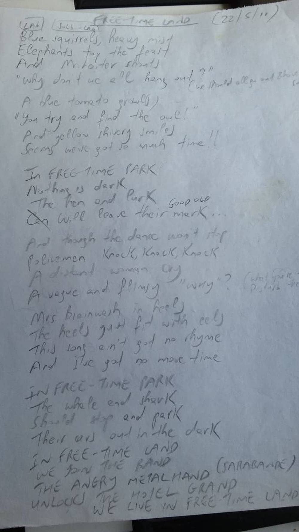 Μια τέτοια περίπτωση είναι και το «Freetime Land». Ήθελα πολύ να γράψω ένα τέτοιο κομμάτι και γι’ αυτό πιστεύω ότι δεν βγήκε όσο καλό θα μπορούσε να βγει. Και αυτό γραμμένο στο πιάνο της μάνας μου. Μουσικά γίνεται χαμός μέσα στο κομμάτι, θυμίζω Αλαβάνο της «Dancing In The Zoo» era. Το ‘χω γαμήσει, το παραδέχομαι, το ήθελα και το έκανα. Αυτό το τραγούδι είναι ένα σουρεάλ εγχείρημα, μού αρέσει πολύ η σουρεάλ στη ροκ. Μού αρέσει πολύ η περίοδος των Beatles που το ψάχνουν πιο πολύ και έχουν γίνει πιο σοφιστικέ, που έχουν ακούσει John Cage. Η περίοδος από το «Strawberry Fields» μέχρι το «Abbey Road» είναι η αγαπημένη μου, κάτι τέτοιο πάω να κάνω με τρομερή αποτυχία, το ξέρω. Αλλά τουλάχιστον οι προθέσεις ήταν καλές.