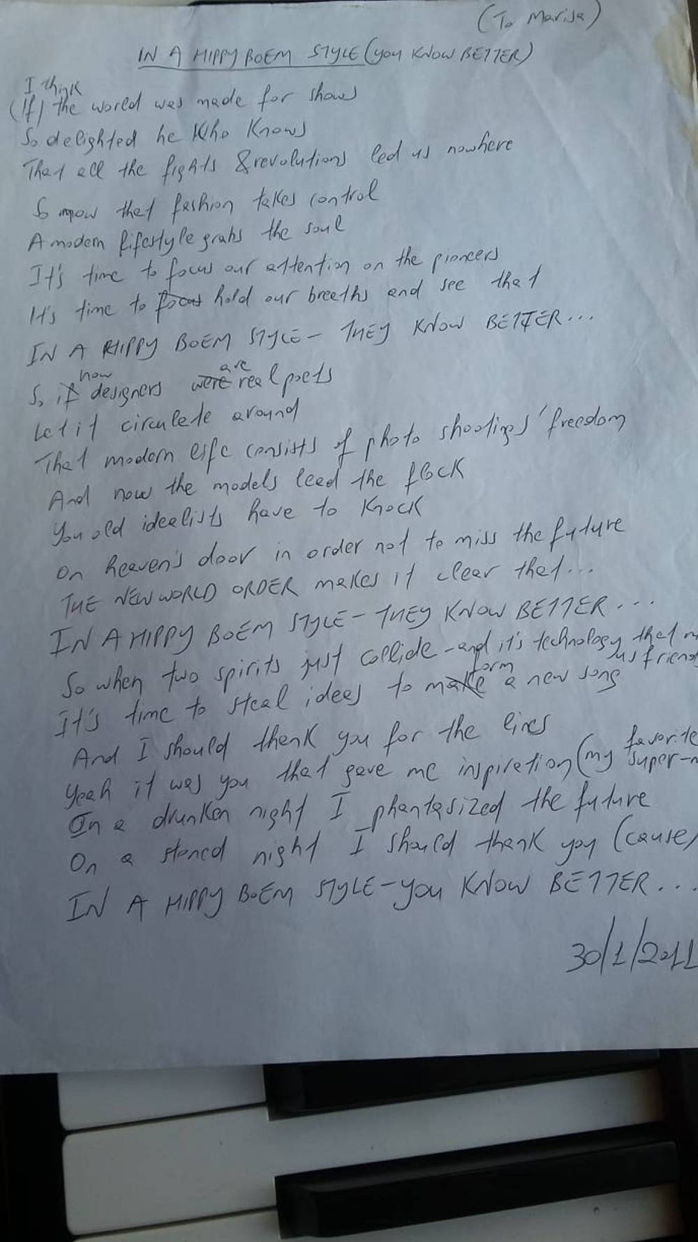Εδώ υπάρχει τρελό back story. Από τα παλιότερα κομμάτια, του 2010. Ανακάλυπτα το internet, ανακάλυπτα τους νέους μου φίλους και το νέο χλοερό τόπο του Facebook σαν παιδάκι. Έκανα μια νεα ιντερνετική φίλη, τη Μαρίζα, που στην πορεία βγήκε ότι είναι συμπατριώτισσα από την Τήνο. Η Μαρίζα λοιπόν κάποια στιγμή είχε ανεβάσει το εξής post: «in a hippy boem mood, some of you may know better» και τρελάθηκα. Είχα πιει και κάτι κρασιά όταν το είδα, λέω "ωραίο!" και της ζητάω την άδεια να το κλέψω, το 2010 όλα αυτά. Μου λέει «ναι, με χαρά». Μάλιστα, ο αρχικός τίτλος αν δεις το τετράδιο που γράφω τα κομμάτια μου, είναι «In a hippy boem style (You know better)” και για κάποιο λόγο, επειδή ήθελα να κάνω ένα video clip με μοντέλα που ποτέ δεν έκανα, το αφιέρωσα στον κόσμο της μόδας. Στον ουτοπικό, ματαιόδοξο κόσμο της μόδας. Σκέφτηκα μοντέλα με ηρωίνη, κόκα, πασαρέλες, τέτοια πράγματα. Τον χώρο της μόδας, αλλά από μια όψη παρακμιακή. Εδώ, όμως, ερχόμαστε στο σημείο μηδέν, ξέχασα την αρχική σύνθεση, όποτε το κομμάτι δεν είναι ποτέ αυτό που ήταν. Ήταν πολύ πιο ωραίο και ακούτε κάτι που είναι απείρως χειρότερο από την αρχική ιδέα που ήταν πολύ καλύτερη. Αυτό που είπα και πριν - άφησα να περάσουν δυο μέρες και μετά δε το θυμόμουν. Άρα είναι λειψό, όμως αυτό το κομμάτι το μεταμόρφωσαν οι Bittersweet και τους δίνω μεγάλο credit, το έκαναν πολύ ωραίο. Η αρχική σύλληψη που είχα ήταν στο στυλ των Joy Division στο «Atmosphere», καμία σχέση το κομμάτι τελικά. Το είχα κάνει πολύ αργό και αυτό, βαρύ και αργό. Όμως, όταν το πήγα στα παιδιά το μεταμόρφωσαν σε ένα δυνατό ροκ κομμάτι που κατέληξε να μου θυμίζει Blur της εποχής «Coffee & TV». Επίσης, και αυτό το φινάλε το απολαμβάνω τρελά. Αν με δεις στο live, θα καταλάβεις.