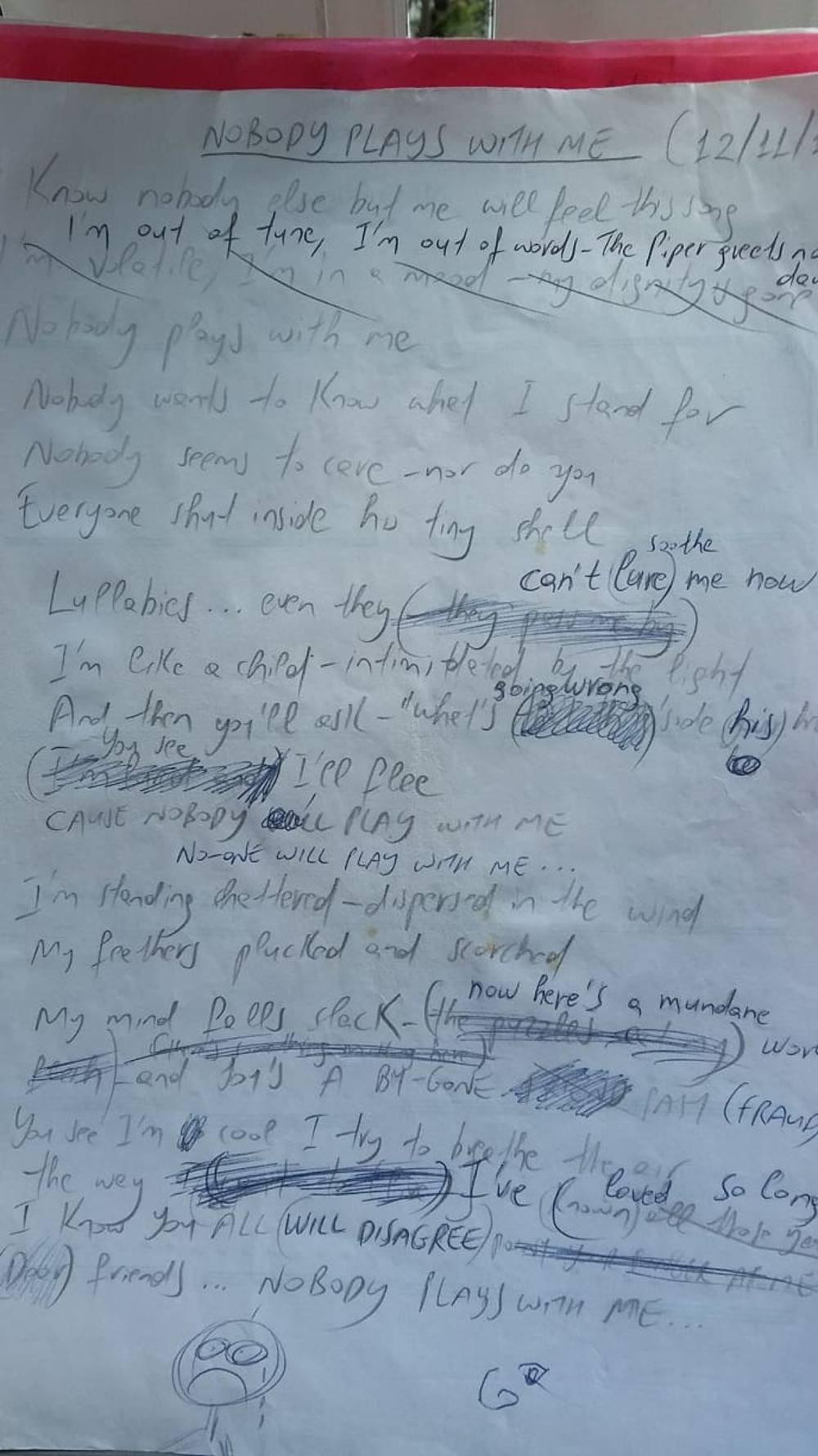 Ήμουν μόνος στο σπίτι, όντως ήταν νύχτα, όντως έπινα Jameson, όντως κανένας "δεν έπαιζε μαζί μου" εκείνη τη δεδομένη στιγμή. Είχα ένα συννεφάκι απελπισίας και μελαγχολίας να βρέχει από πάνω μου και ήρθε αυτό το γαμημένο το ακόρντο, μια ελαττωμένη που αλλάζει όλο το κομμάτι. Μετά από εκεί ένιωθα ότι θα έχω ένα κομμάτι που θα είναι το μεγάλο μου στοίχημα, ότι θα είναι το μεγάλο μου κομμάτι. Νομίζω ότι δεν το έχω ξεπεράσει ακόμα και αναρωτιέμαι αν θα το ξεπεράσω κάποια στιγμή. Γιατί εγώ αισθάνθηκα πολύ εντάξει. Ξέρεις, ο συνθέτης πολλές φορές σκέφτεται ότι κάτι άφησε, κάτι του ξέφυγε. Ακούει το κομμάτι και νιώθει χάλια. Το «Nobody Plays With Me» μου αρέσει όλο, ακριβώς έτσι όπως είναι, το ήθελα έτσι ακριβώς. Το φαλσέτο βγήκε εκείνη την ώρα, δεν ξέρω γιατί, δεν ξέρω πώς. Οι στίχοι είναι της πλάκας, αλλά δεν με νοιάζει επίσης. Γιατί αυτό που ήθελα ήταν να εκφράσω έναν απλό ανεπιτήδευτο πόνο. Ακούστε με, φωνάζω, είμαι μόνος μου σε ένα σπήλαιο, μεγεθύνεται η ηχώ, κανένας δεν παίζει μαζί μου. Είμαι σκατά. Πάλι μου βάλανε χέρι ότι είναι παιδικό, ότι κάνω σαν παιδάκι. Δεν με νοιάζει να δείξω ότι έχω αδύναμες πλευρές, ποιος είμαι για να μην έχω; Εχώ πολλές και χτυπητές αδύναμες πλευρές και τις αγαπάω, τις αγκαλιάζω και τις κανω τραγούδια. Γιατί από γνήσιο πόνο βγαίνει μεγάλη μουσική. Παρεμπιπτόντως, ετοιμάζεται ένα πολύ ωραίο video clip εντελώς arty.