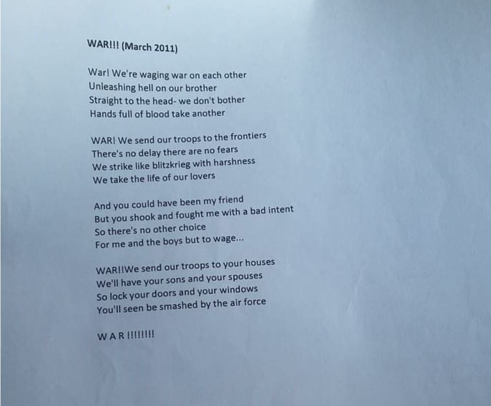 Το «War» είναι ένα ευθύ ειλικρινέστατο κομμάτι, δεν μπορώ να σου πω πολλά γι’αυτό. Έκλεισα το τηλέφωνο, είχα τσακωθεί με μια τύπισσα, δεν θα αναφέρω ονόματα. Πέταξα το τηλέφωνο και έγραψα το κομμάτι φίλε. Πήρα την ακουστική και άρχισα να παίζω μινόρε σε αλληλουχία τρίτης μικρής, μπορεί να είναι και τρίτη μεγάλη η απόσταση, αλλά είναι συνεχόμενα μινόρε ακόρντα που δίνουν ένα δραματικό υπόβαθρο στη μουσική. Αυτό το τρικ έχει παιχτεί πολύ, δυστυχώς για εσάς που θα το ακούσετε, στην prog μουσική και στην Canterbury scene. Δηλαδή και ο Mike Oldfield και ο Hammill, ο αγαπημένος μου, έχουν παίξει πάρα πολύ με τα συνεχόμενα μινόρε ακόρντα. Το οποίο είναι ένα κόλπο που έρχεται από τη σύγχρονη κλασσική μουσική. Πάντα στο μυαλό μου υπάρχει παρά πολύ μεγάλη ειλικρίνεια και αυθορμητισμός, αλλά υπάρχει και μια οργάνωση, μουσική. Σκέφτομαι μουσικά δηλαδή, δεν θέλω να το αφήνω και στην τύχη του εντελώς. Να σου πω την αλήθεια, κάποια στιγμή θέλω να γράψω και στην τύχη, να δω τι θα βγει, αλλά είμαι σπασίκλας.