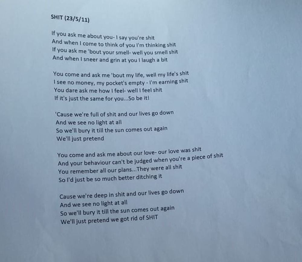 Ήμασταν στο μπαλκόνι μιας παλιάς μου μαθήτριας, της Άντζελας, και με κερνούσε συνέχεια αψέντι. Καταλαβαίνεις… Είχαμε μια κιθάρα και απλά έγραψα το «Shit». Πραγματικά είναι από τα πιο έντονα κομμάτια του δίσκου γιατί ήμουν πολύ χάλια εκείνη την περίοδο. Αυτό και το «Nobody Plays With Me» έχουν τον πιο πολύ θυμό. Έψαχνα την Ευανθία (σ.σ. το κορίτσι του Νικόλα) χωρίς να ξέρω ότι υπάρχει και είχα κάνει κάποιες σχέσεις που δεν με κάλυπταν καθόλου και επαγγελματικά η ζώη μου δεν πήγαινε όπως την ήθελα, εξ’ ου και το «Shit». Επίσης, είναι ακόμα ένα κομμάτι που είναι και για την κρίση, γιατί τελικά το συνέδεσα με τον γενικό περίγυρο. Βγήκε πάρα πολύ εύκολα, αυτό θεωρήσαμε αρχικά «σουξέ» και ότι θα είναι το πρώτο single, το γούσταραν όλοι στην μπάντα από την αρχή. Βέβαια, πολλούς παλιούς μας fans τους αποξενώσαμε, γιατί πίστεψαν ότι ξεπουλήθηκα με το τραγούδι αυτό. Πάρα πολλοί μού γύρισαν την πλάτη, έπεσε κράξιμο. Εγώ προσπάθησα να φτιάξω ένα καλοφτιαγμένο κομμάτι στο στυλ του "You Don't Want Me Babe" από τον πρώτο δίσκο. Μου αρέσει η καλή pop, μου αρέσει η εμπορική pop, όταν έχει καλές προθέσεις είναι φοβερή. Είναι γνωστό ότι λατρεύω τους Beatles, γιατί όχι; Είναι ένα κομμάτι που μου βγήκε πάρα πολύ εύκολα, μέσα σε 25 λεπτά, οι στίχοι δεν είναι κάτι ιδιαίτερο, αλλά δεν με νοιάζει. Δεν ήθελα και δεν θέλω πάντα οι στίχοι να είναι ψαγμένοι, ούτε στο προαναφερθέν «You Don’t Want Me Babe» ήταν ψαγμένοι.