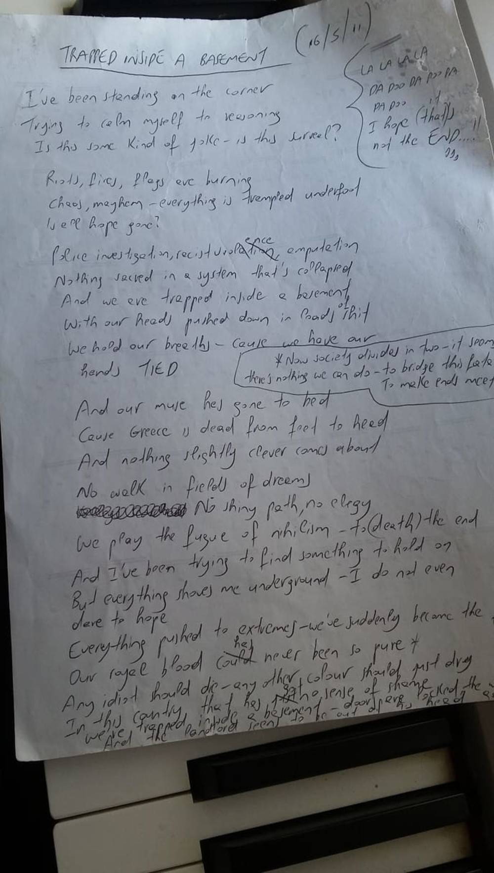 Πολύ σωστή παρατήρηση. Στιχουργικά. Είναι και 8 χρόνια μετά δε μπορώ να τα θυμάμαι όλα, αλλά αν κάτσω και ακούσω το άλμπουμ μαζί σου, μπορώ να σου λέω πού γίνεται τι. Να πω και κάτι άλλο που θυμήθηκα: Το κομμάτι έχει μια ξεκάθαρη μελωδική γραμμή, που γράφτηκε στο πιάνο και την παίρνουν τα άλλα όργανα και η φωνή. Στο δίσκο, οι μισές συνθέσεις είναι στην κιθάρα και οι άλλες μισές στο πιάνο. Το πιάνο που χρησιμοποίησα κατά κύριο λόγο είναι ένα παλιό τσέχικο, Petrof, στο σπίτι της μάνας μου.