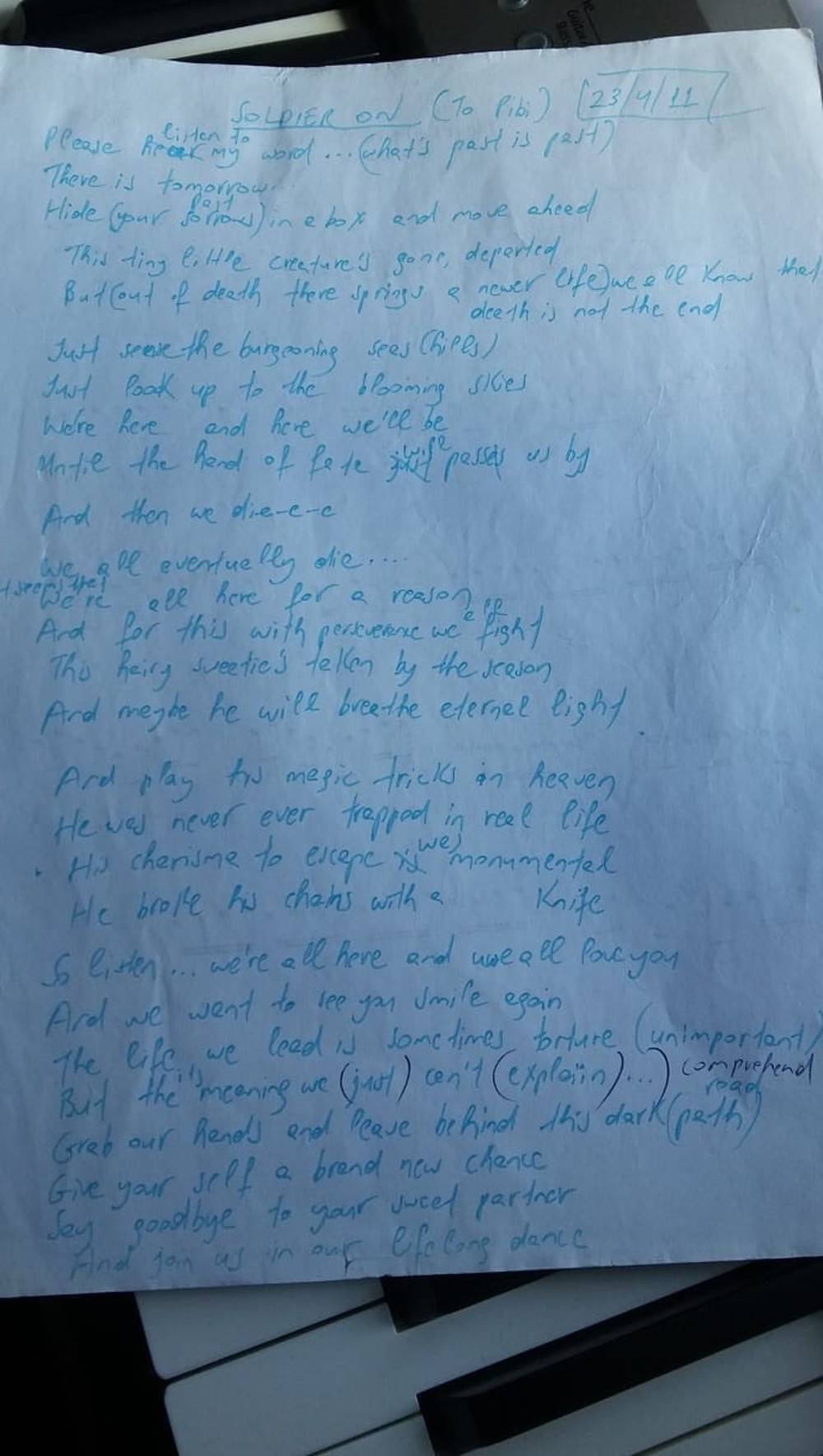Και μένα. Αν μου επιτρέπεται να έχω αγαπημένα, είναι από τα αγαπημένα από αυτό το άλμπουμ. Στην Τήνο πάλι. Ήταν Πάσχα του 2011 και ήμουν με τον φίλο μου τον Ρίγκο και του εξηγούσα. Με τον Δημήτρη πάντα αγαπιόμαστε και τσακωνόμαστε, αλλά του αναγνωρίζω ότι ηθελε πάντα να μαθαίνει, πολύ φιλομαθής. Του εξηγούσα λοιπόν πώς μπορείς να μεταφέρεις κλασσικές μεθόδους σύνθεσης στο σύγχρονο ροκ και του έλεγα ότι αυτό δεν συμβαίνει απαραιτήτως μόνο στην prog. Μπορείς να κρατήσεις ένα σταθερό μπάσο. Σκέψου στο αριστερό χέρι στο πιάνο ένα μπάσο και να αλλάζεις τα ακόρντα, τον ισοκράτη που λέμε. Έτσι στήθηκε μουσικά το «Soldier On». Υπάρχει ένα σταθερό μπάσο στο αριστερό και τα ακόρντα στο δεξί. Μόνο που αυτό το έκανα στην κιθάρα και του το εξηγούσα, εκείνη την ώρα επί τόπου συνελήφθη το τραγούδι. Ξεκάθαρα είναι ένας φόρος τιμής στο prog. Στους Procol Harum 89% και στον Peter Hamill 11%. Άλλοι που ακούν το κομμάτι θα σου πουν Queen και άλλα 100 γκρουπ. Εμένα μου αρέσει πάρα πολύ όταν παίρνει το κοινό τα τραγούδια σου και τα αναλύει, τρελαίνομαι.