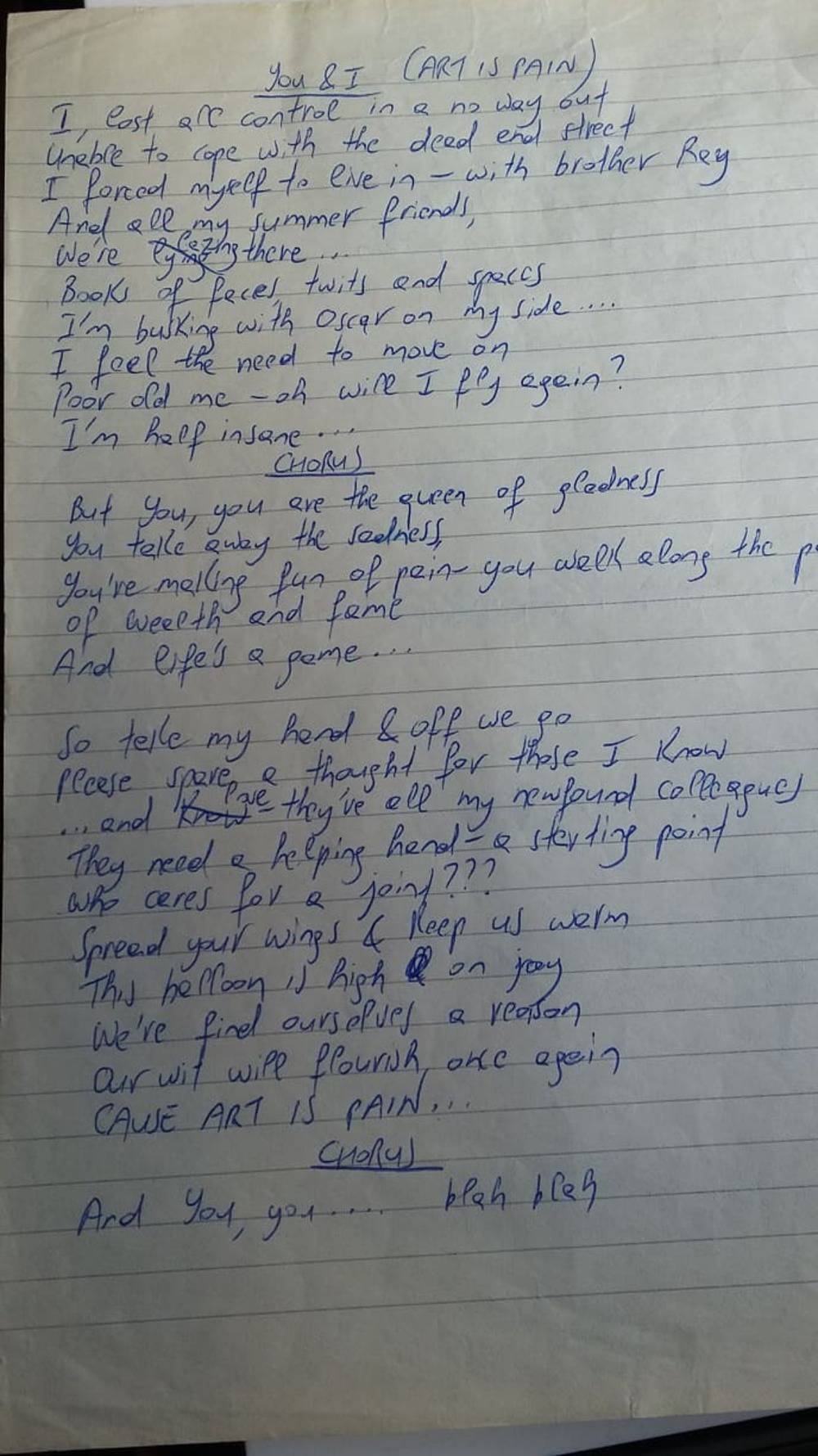 Λοιπόν, αυτό το τραγούδι το σκέφτηκα στο ασανσέρ του σπιτιού της μάνας μου, επηρεασμένος από το τότε πρόσφατο solo του Morissey. Ο Morissey στα σόλο του, είτε τον γουστάρεις είτε όχι, το έχει ψάξει πιο ευρέως μουσικά από ό,τι με τους Smiths - βέβαια οι Smiths μου αρέσουν πάρα πολύ, κόβω και τις 100 φλέβες και από τα δύο χέρια. Αλλά είχε πειραματιστεί λίγο με τη φόρμα της μπαλάντας. Οπότε σκέφτηκα την πρώτη γραμμή που είναι σε ντο μινόρε με διάφορα μπάσα που κατεβαίνουν χρωματικά. Εκεί, μέσα στο ασανσέρ. Έκατσα στο πιάνο των γονιών μου και το έγραψα. Στο πατρικό μου έχω συνθέσει πάρα πολλά κομμάτια. Το πιάνο είναι πάρα πολύ μεγάλη καύλα. Γιατί έχεις όλες τις φωνές, έχεις απεριόριστες δυνατότητες και για να σκεφτείς την μελωδική γραμμή και για να σκεφτείς το αρμονικό υπόβαθρο. Μετά το πήρα στην κιθάρα. Είναι στο κλειδί του ντο μινόρε, που επίσης είναι δύσκολο για κιθαρίστες-τραγουδιστές, οπότε έβαλα καποτάστο για να μπορώ να τραγουδάω και ελεύθερα. Είναι για μια γκόμενα, είναι για γκόμενες ψωνισμένες. Αν και η έμπνευσή μου, ήταν άδικο που της επιτέθηκα τόσο της κοπέλας (δεν θα πω όνομα), δεν άξιζε τέτοια επίθεση. Δεν είναι ακριβώς επίθεση, είναι συγκαλυμμένη επίθεση. Το νόημα είναι να μην αποζητάς τόσο πολύ την προσοχή του κόσμου, απλά να είσαι ο εαυτός σου, γιατί είσαι πάρα πολύ ικανή. Τελικά μάλλον μου βγήκε ένα je t’aime τραγουδάκι γαλλικής υφής, ξαναγυρνάμε στον Gainsbourg. Στις πρόβες γινόταν νταβαντούρι, έκαναν ότι χορεύουν μπαλέτο, o Ρίγκος έκανε τον μαέστρο κλασικής ορχήστρας με τις μπαγκέτες του, με κοροϊδεύανε. Το τέλος, για να κλείσω, μου θυμίζει Creedence Clear Water Revival στη διασκεύη τους στο «I Put A Spell On You». Γι’ αυτό ξεφεύγω τόσο πολύ. Σκέφτηκα αυτό το noir, το κατάμαυρο που το έχει και ο Cave στο «Muddy Water», αυτό το πολύ ζοφερό που σου αρπάζει την καρδιά και την ψυχή και στην τρώει και γι’ αυτό το απολαμβάνω τόσο πολύ, είμαι της μαυρίλας. Το δηλώνω και είμαι περήφανος γι’ αυτό. Λίγες φωτεινές εκλάμψεις σε μια γενική μαυρίλα...