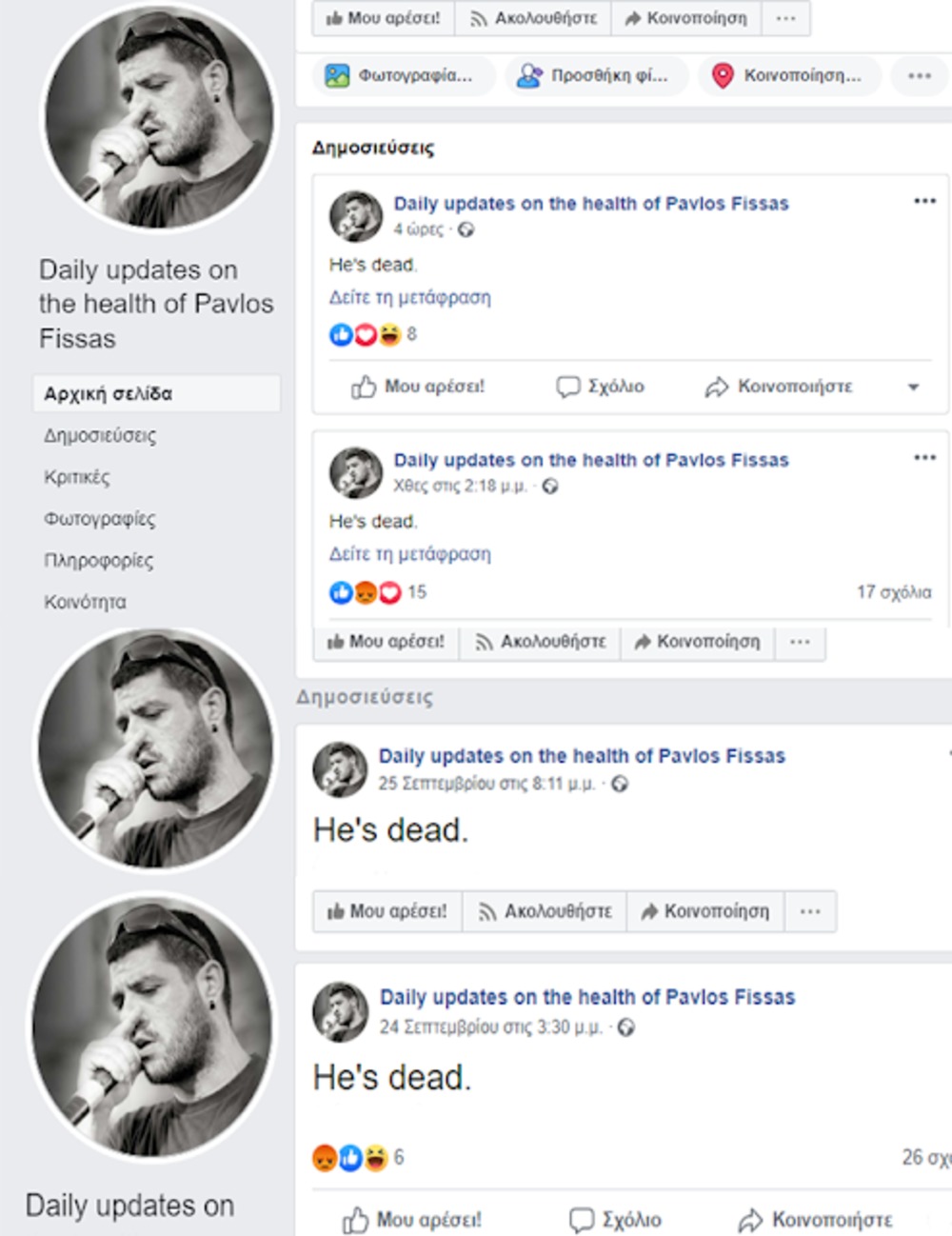 Ημερομηνίες σημαδεμένες με κόκκινο στιλό. Ο θάνατος του Παύλου Φύσσα... 18 Σεπτεμβρίου, 6 χρόνια πέρασαν. Και ήρθαν 2-3 υπάνθρωποι τη μέρα εκείνη, την ημέρα της 6ης επετείου, κι έφτιαξαν μια σελίδα στο facebook και την ονόμασαν "Daily Updates On The Health of Pavlos Fissas", πάει να πει "Ημερήσιες Ενημερώσεις για την Υγεία του Παύλου Φύσσα". Και μια φορά τη μέρα λοιπόν πόσταραν την ενημέρωση: "He's dead", πάει να πει "Είναι νεκρός". Και κάποιοι φίλοι τους από κάτω κάνανε καρδούλες και γελάκια και σχόλια μοχθηρά και ειρωνικά... Κι ήταν κι ευτυχώς κι άλλοι πολλοί που κάνανε θυμωμένες και δακρυσμένες φατσούλες και γράφανε σχόλια επιθετικά, υπερασπίζονταν τη μνήμη και την ιστορία του Παύλου, και κάνανε και reports, ώσπου η σελίδα επιτέλους προς το τέλος του μήνα έπεσε, αφού πρώτα την είχαν μάθει και οι γονείς του Παύλου και είχαν κινηθεί νομικά εναντίον ενός ακόμα εμετού.