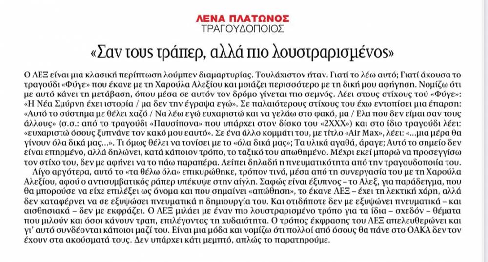 Αντιθέτως, πλάκα είχε τελικά η φάση με την Λένα Πλάτωνος και το κείμενό της για τον ΛΕΞ, αν και στην αρχή είχα φουλ νεύρα, περισσότερο με όσα ακολούθησαν παρά με την ίδια την Πλάτωνος. Πάντως, δεν καταλαβαίνω εξαρχής και εκ πρoοιμίου γιατί έπρεπε η Λένα Πλάτωνος να γράψει κάτι για τον ΛΕΞ στη συγκεκριμένη χρονική στιγμή - τη στιγμή που ο ΛΕΞ θα γεμίσει με 100.000 κόσμο το ΟΑΚΑ για την Καλοκαιρινή του συναυλία, που έκανε μάλιστα και σχεδόν ακαριαίο sold-out.. Μπήκε έτσι και αυτή στον τυχάρπαστο αχταρμά των “είδα φως και μπήκα” τύπων, που αναφέρονται στον Σαλονικιό ράπερ όποτε γεμίζει με χιλιάδες κόσμο μια συναυλία. Συνομοταξία Πορτοσάλτε κλπ.