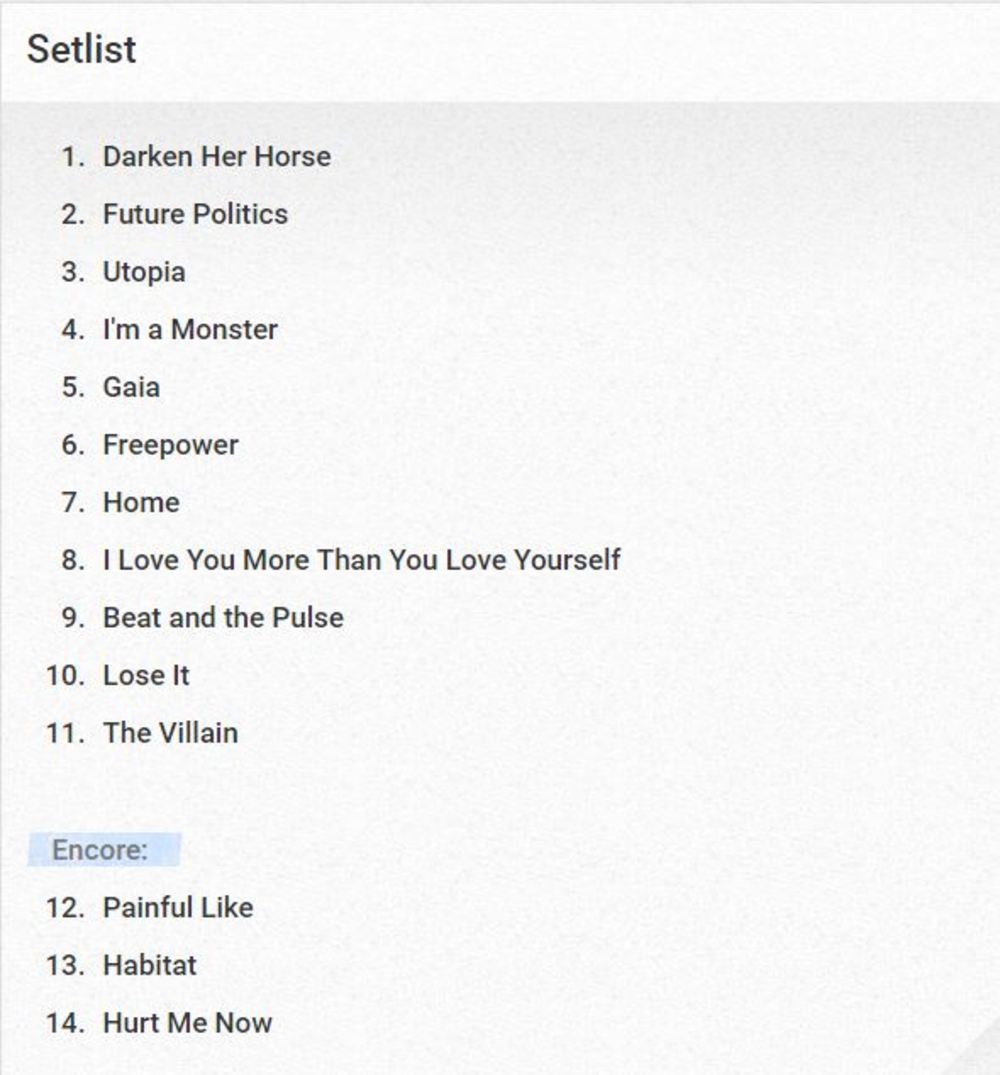Η συναυλία ολοκληρώθηκε με δυνατή διασκευή του “The Villain” και έπειτα ακολούθησε encore τριών τραγουδιών, μεταξύ των οποίων και το “Habitat” που κυριολεκτικά τα έσπασε. Η συναυλία έκλεισε με το “Hurt me now” σε συγκλονιστική εκτέλεση. Τόσο καλά παιγμένο που δεν ήθελα να τελειώσει.