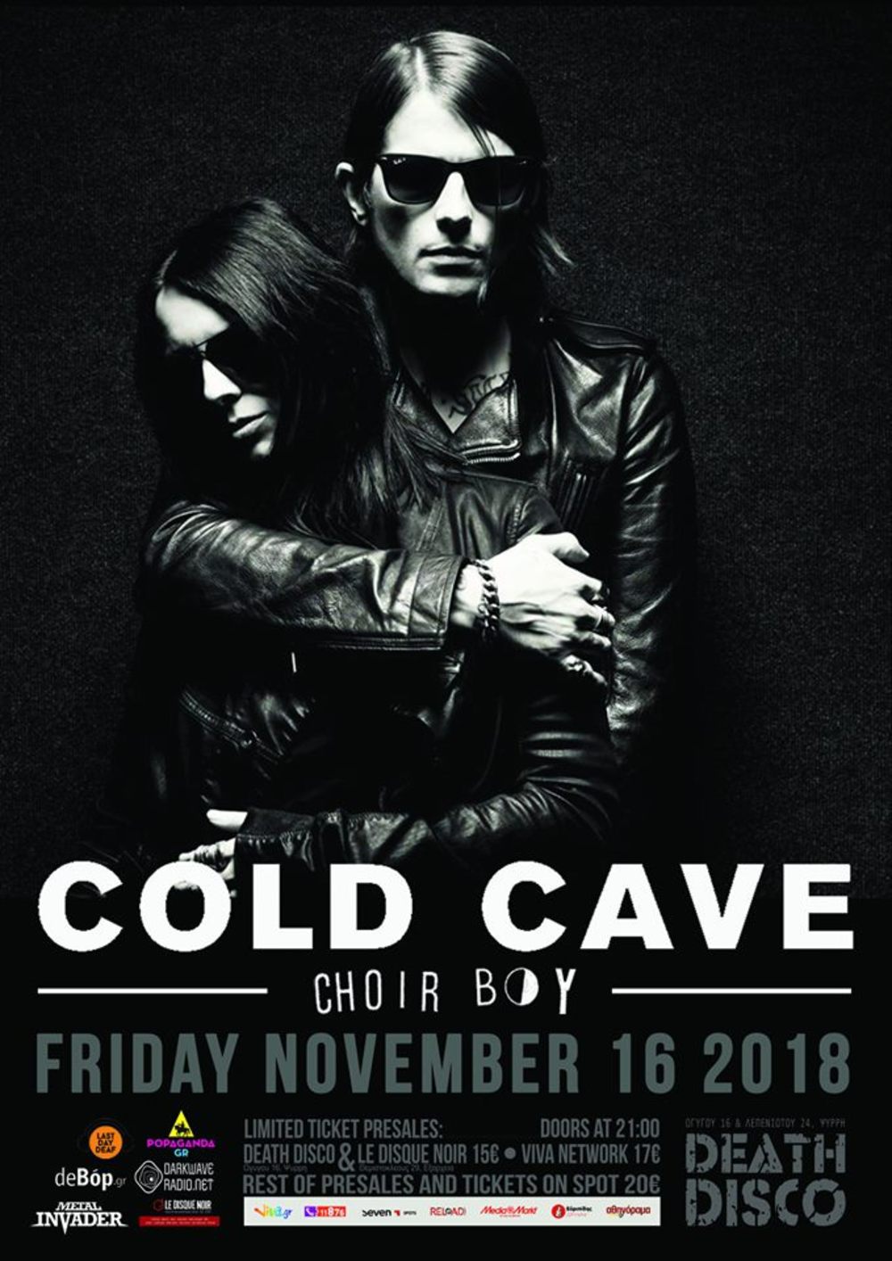 Με βιομηχανικούς ήχους φτιάχνουν την πιο catchy gothic pop μουσική που μπορείς να ακούσεις σήμερα και τη Παρασκευή 16 Νοεμβρίου θα βρεθούν για πρώτη φορά με full band στην Ελλάδα και στον πλέον κατάλληλο χώρο για τέτοιου είδους συναυλίες, το Death Disco. Η χωρητικότητα είναι περιορισμένη και αναμένεται τα εισιτήρια να εξαντληθούν με γοργούς ρυθμούς, για αυτό φρόντισε άμεσα να εξασφαλίσεις οτι θα είσαι ανάμεσα στους 250 τυχερούς που θα έχουν την ευκαιρία να δουν από κοντά τους εκπληκτικούς Cold Cave στη μια και μοναδική εμφάνιση που έχουν προγραμματίσει να κάνουν στη χώρα μας!