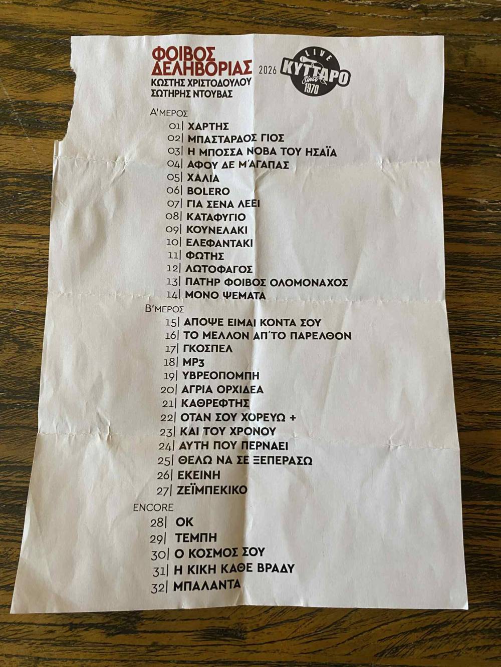 Ξεκίνημα με μία κάπως άνευρη απόδοση του “Απόψε Είμαι Κοντά Σου”, αποζημίωση όμως άμεση με μάλλον το πιο αγαπημένο μου τραγούδι απ’όλη τη δισκογραφία του Δεληβοριά, το “Μέλλον απ΄το Παρελθόν” από τον δίσκο “Καθρέφτης” του πολύ μακρινού πια 2003. Απίστευτο πώς, 23 ολόκληρα χρόνια έπειτα, το συγκεκριμένο τραγούδι κατορθώνει να με τραντάζει ολόκληρο όπως την πρώτη φορά που το άκουσα, στις παραστάσεις “ΚαΨιΜί” τότε, τον Χειμώνα του 2002-2003. Κι ύστερα, έτσι όπως οι αναμνήσεις μου και όσα άπειρα έχω περάσει με τη μουσική αυτού του τύπου εδώ και τρεις δεκαετίες, ο Φοίβος με χαιρετίζει από σκηνής και οριακά με πιάνουν δάκρυα, τον χαιρετάω κι εγώ με όλη την αγάπη μου, είναι αδερφός ο Φοίβος. Με χαιρετίζει και μου αφιερώνει, σε εμένα και σε άλλους φίλους του, το επόμενο τραγούδι, το καινούριο “Gospel”. Υπέροχο κομμάτι, που ανυπομονώ να ξαναπάω το άλλο Σάββατο στο Κύτταρο και να το ξανακούσω.