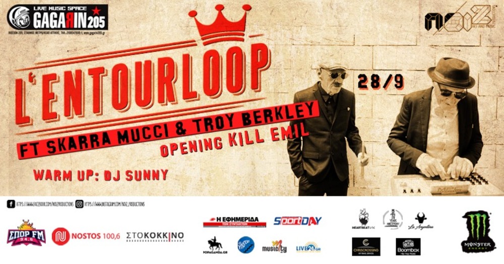 Το καλοκαίρι σιγά σιγά μας χαιρετά, αλλά εμείς θα το αποχαιρετήσουμε έτσι όπως πρέπει το τελευταίο Σάββατο του Σεπτέμβρη στο Gagarin 205 υπό τους ταξιδιάρικους και χορευτικούς ήχους των Γάλλων L' Entourloop. Μια πενταμελής μπάντα, κολλεκτίβα, με "αρχηγούς" τους Sir James και King Johnny. O ήχος τους αν και από τους περισσότερους χαρακτηρίζεται ώς reggae hip-hop αν τον αφουγκραστείτε λίγο πιο βαθειά θα βρείτε μέσα λίγο απ' όλα εναρμονισμένα και δεμένα μεταξύ τους με πολύ ωραίο τρόπο. Τελευταία τους δουλειά είναι το ep "Bangarang" σε συνεργασία με τον Skarra Mucci o οποίος θα είναι και στην σκηνή του Gagarin μαζί τους όπως θα είναι και ο Troy Berkley. Την συναυλία ανοίγουν ο βραζιλιάνος παραγωγός και dj Kill Emil που έχει ως βάση την Ελλάδα από το 2009.