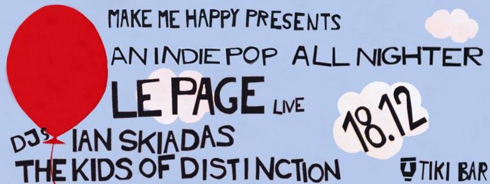 "Λίγο πριν τα Χριστούγεννα, η ομάδα ' Make me happy ' σας προσκαλεί σε μια ακόμη indie pop extravaganza. Αυτή τη φορά, καλεσμένοι της θα είναι οι Le Page, που θα παίξουν για πρώτη φορά ζωντανά, έπειτα από τρία χρόνια!