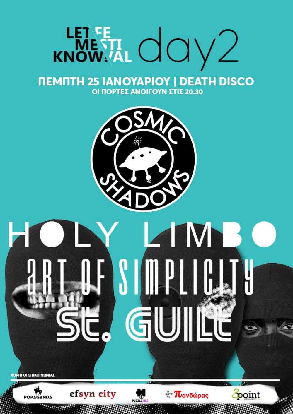 Holy Limbo, με νέα σύνθεση τους Anthony Ka (Cyanna), Φοίβος Βαλαβάνης και Γιώργος Λιάπης (από το project του Χρήστου Αλεξόπουλου και της Μαρίας Λατσίνου) και ο Ekelon (Palirria & Egg Hell) σε ηλεκτρικά και ηλεκτρονικά soundscapes μεταψυχεδελικής rock για ένα διάλειμμα από την ηχογράφηση του καινούριου τους άλμπουμ στο stage του φεστιβάλ.