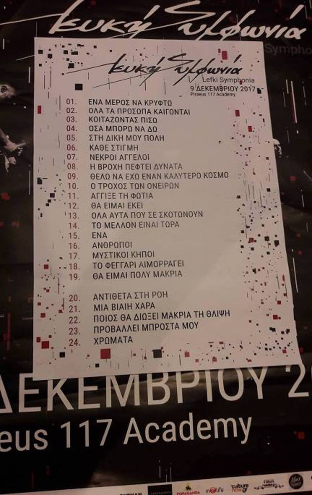 Ήμασταν πολλοί στο Piraeus 117 Academy. Όχι πάρα πολλοί, όπως πίστευα ότι θα συμβεί, αλλά καμία σημασία δεν είχε αυτό, γιατί έχω την αίσθηση ότι κανείς δε βρέθηκε εκεί με νοσταλγική διάθεση. Ήμασταν εκεί γιατί απλά είχαμε ανάγκη να (ξαν)ακούσουμε Λευκή Συμφωνία. Το κατάλαβα αυτό, όταν μετά από...άπειρα χρόνια σε συναυλία "έπιασα κάγκελο" και κοίταζα τους ανθρώπους γύρω μου και ένα ολόκληρο μαγαζί πίσω να τρελαίνεται σε κάθε τραγούδι και να ουρλιάζει κάθε στίχο. Μέχρι και ο Θοδωρής από κάποια στιγμή και μετά μας "παρέδωσε" το μικρόφωνο. Όλοι μαζί καλύτερα από έναν...