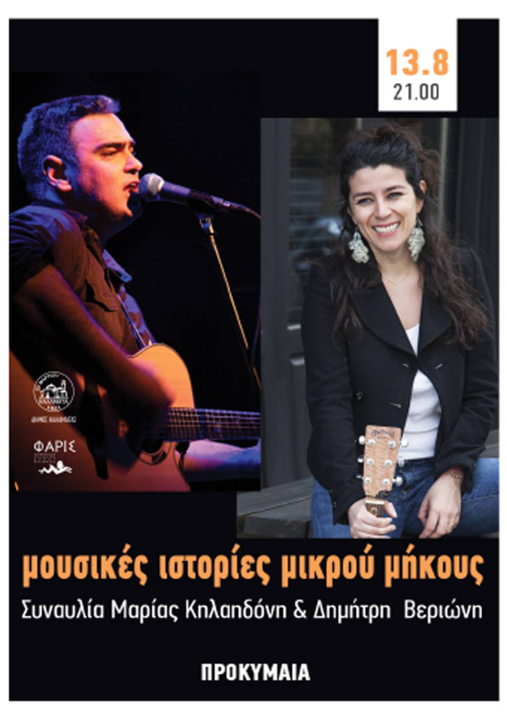 Η Μαρία Κηλαηδόνη και ο Δημήτρης Βεριώνης συναντώνται επί σκηνής αυτό το καλοκαίρι και παρουσιάζουν με τρυφερότητα, κέφι και ευαισθησία ένα live γεμάτο μουσικές ιστορίες μικρού μήκους. Οι δύο τραγουδοποιοί εναλλάσσονται και συμπράττουν επί σκηνής και ερμηνεύουν τραγούδια από τη δισκογραφική τους πορεία, αλλά και από τις αγαπημένες τους μουσικές καταβολές.