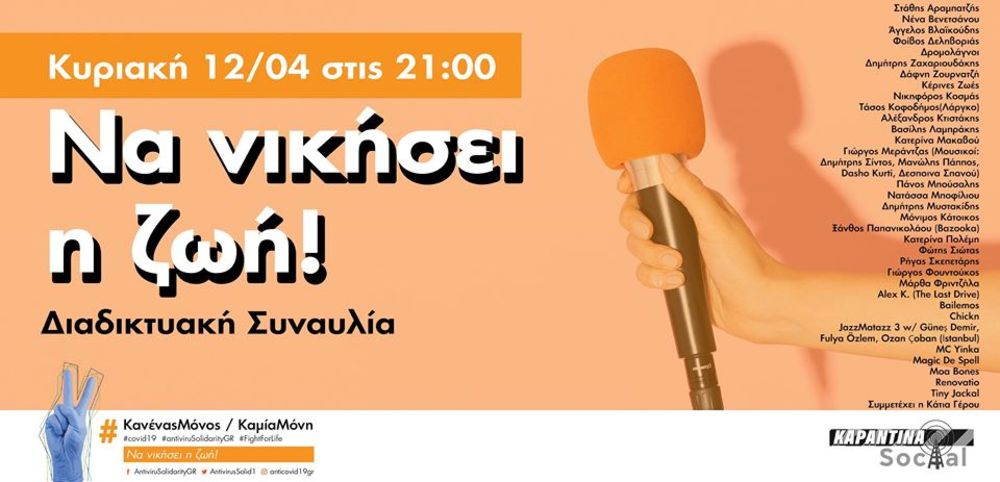 Κυριακή βράδυ λοιπόν τα λέμε στη συναυλία. Καλέστε τους φίλους σας και συντονιστείτε στη σελίδα μας Covid19: Κανένας Μόνος / Καμία Μόνη!