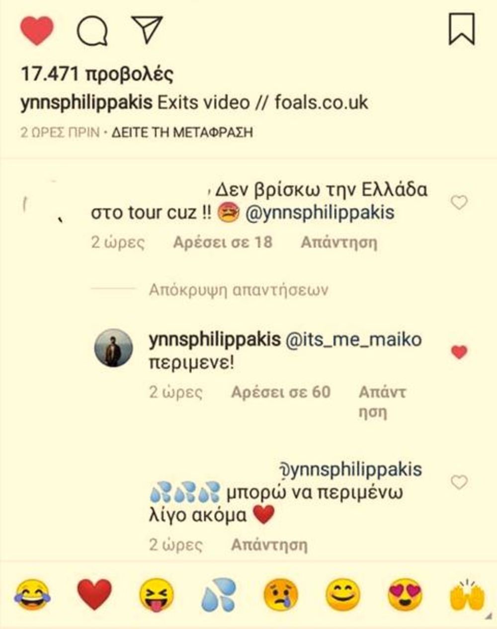 Ένας διάλογος στο instagram του Yannis Philippakis, frontman των Foals, με ένα μάλλον Έλληνα ξάδερφό του (βλ. "cuz") μας προϊδεάζει για μία πιθανή και ιστορική έλευση της Βρετανικής μπάντας στα μέρη μας... Το ότι μέσα στο 2019 αναμένονται και οι νέοι δίσκοι τους -ω,ναι! θα είναι δύο / "Everything Not Saved Will Be Lost Part 1 & 2"- πιθανότατα θα φέρει το σχήμα σε tour κι έτσι το σενάριο της συναυλίας τους στην Ελλάδα μοιάζει ακόμα πιο αληθινό.
