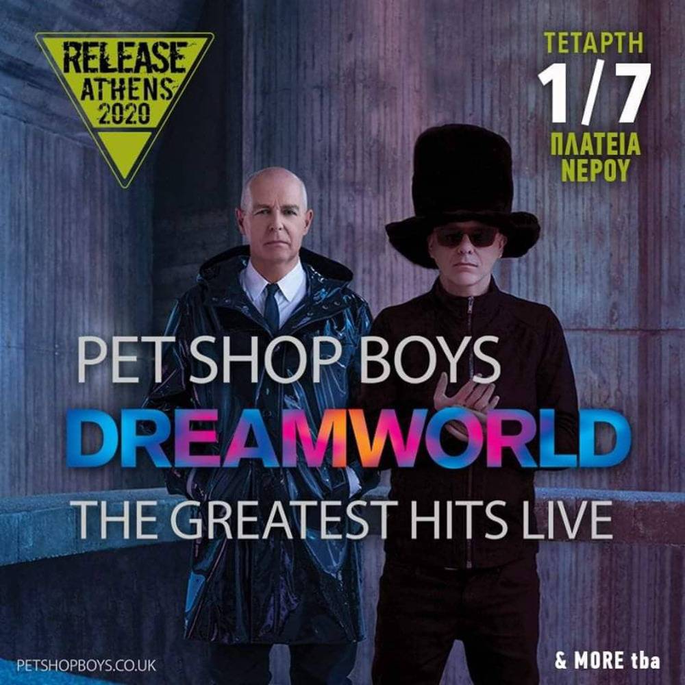 Το Release Athens 2020 υποδέχεται τους Pet Shop Boys, την Τετάρτη 1η Ιουλίου στην Πλατεία Νερού. Οι Neil Tennant και Chris Lowe, το πιο επιτυχημένο ντουέτο στην ιστορία της Βρετανικής σκηνής, έρχονται στην Αθήνα με το εντυπωσιακό "Dreamworld: The Greatest Hits Live" show τους, γεμάτο από τις μεγαλύτερες επιτυχίες της σπουδαίας καριέρας τους.