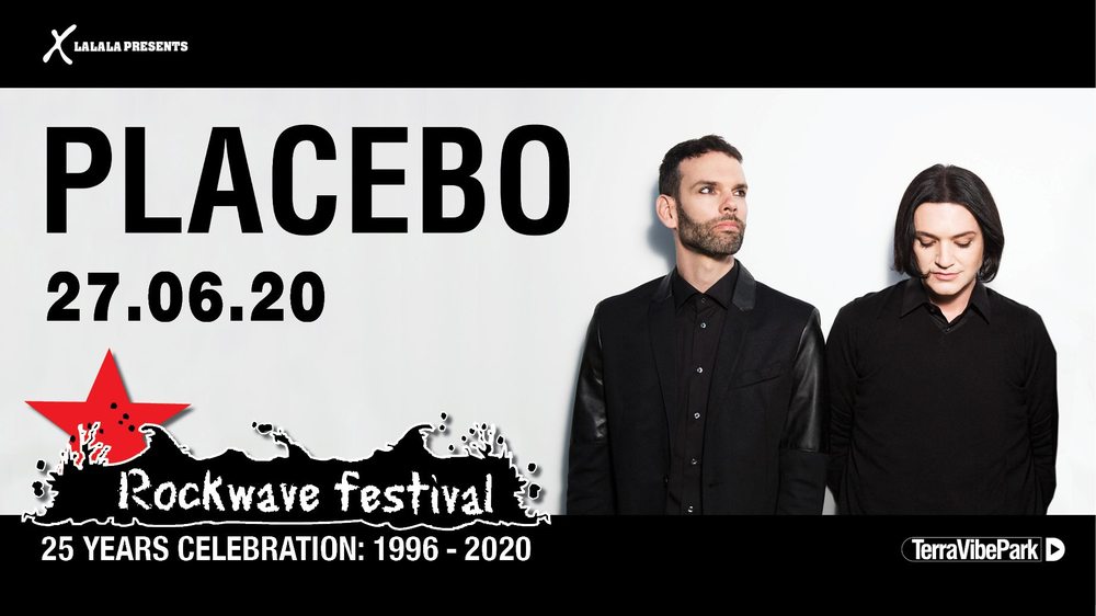 Placebo (λεξικό: εικονικό φάρμακο), Placebo (μουσικό λεξικό: βρετανικό εναλλακτικό ριζοσπαστικό συγκρότημα που από το 1994 ταράζει τα μουσικά ύδατα παγκοσμίως). Η πρώτη τους εμφάνιση στην Ελλάδα ήταν στο Rockwave του 1999 στον Άγιο Κοσμά, μία εμφάνιση που έμεινε αξέχαστη σε όσους την έζησαν! Έκτοτε, οι Placebo έχουν προσφέρει κι άλλες αξέχαστες εμφανίσεις στο ένθερμο ελληνικό κοινό επιστρέφοντας τη λατρεία που τους δείχνει σταθερά τα τελευταία είκοσι χρόνια. Έτσι, το συγκρότημα επιστρέφει στο Rockwave 2020 στη γνώριμη σκηνή του TerraVibe Park ως headliner το Σάββατο 27 Ιουνίου, στην πιο καίρια στιγμή της καριέρας τους για να γιορτάσει μαζί μας τα 25 χρόνια Rockwave Festival! Επιλέγοντας την Αθήνα για τις περιορισμένες εμφανίσεις που σχεδιάζουν για το 2020, οι Placebo αποδεικνύουν έμπρακτα την αγάπη και την ευγνωμοσύνη τους στη δική τους ελληνική λεγεώνα των fan!
