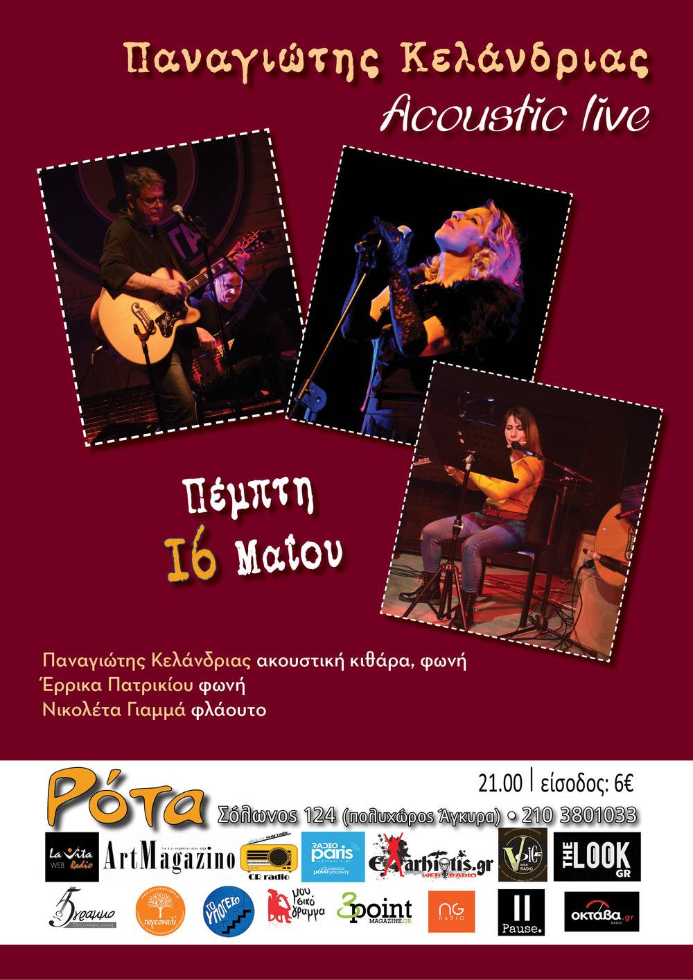 Μετά από τις εμφανίσεις του στην Κέρκυρα με τη fullband, ο Παναγιώτης Κελάνδριας επιστρέφει στην Αθήνα μετά από καιρό, αυτή τη φορά με ανανεωμένο και ξεχωριστό ακουστικό σχήμα. Έχοντας ήδη τρεις δισκογραφικές δουλειές στο ενεργητικό του και αρκετά τραγούδια και συνεργασίες στις αποσκευές του, "στήνει" μια ξεχωριστή μουσική παράσταση για πρώτη φορά στη φιλόξενη Ρότα παρέα με εκλεκτούς φίλους μουσικούς. Εκτός από τη μόνιμη συνεργάτιδα του Νικολέττα Γιαμμά στο φλάουτο, μαζί του για πρώτη φορά επί σκηνής η ερμηνεύτρια Έρρικα Πατρικίου. Κοινός τόπος τους είναι και το ολοκαίνουργιο τραγούδι «Αυτό το λίγο» (που θα ερμηνεύσει η Έρρικα Πατρικίου σε μουσική δική του και στίχους Μαρίας Παπαδάκη) το οποίο αναμένεται να κυκλοφορήσει μέσα στο Μάιο.
