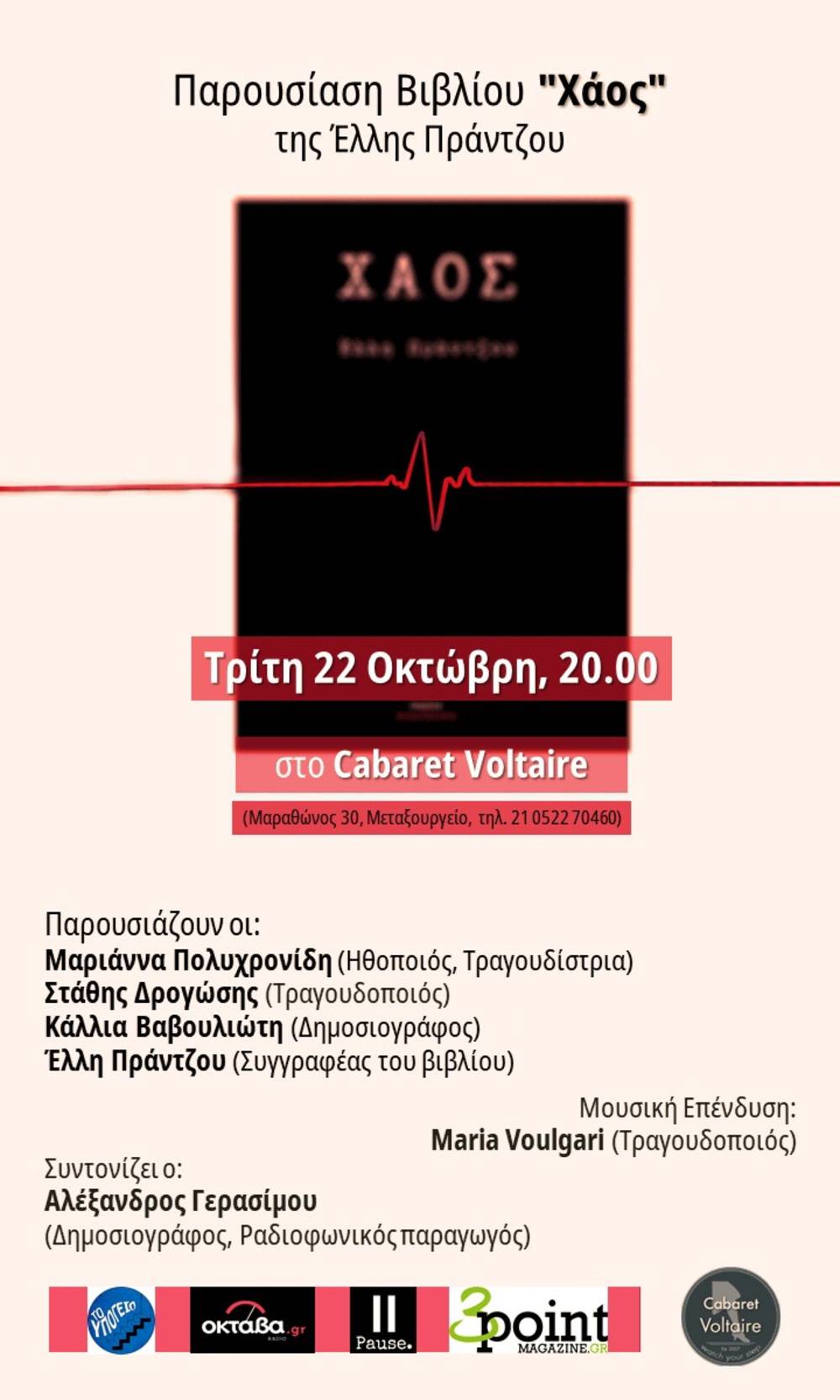 Η συλλογή μικρών ποιημάτων "Χάος" των εκδόσεων Οσελότος αποτελεί το πρώτο έντυπο εγχείρημα της Ελλης Πράντζου και βρίσκεται ήδη στη δεύτερη έκδοση. Θα χαρούμε να σας δούμε στην παρουσίαση που θα γίνει την Τρίτη 22 Οκτώβρη, ώρα 20.00, στο Cabaret Voltaire (Μαραθώνος 30, Μεταξουργείο). Δεν απαιτείται τίποτε παραπάνω από την καλή σας διάθεση ώστε να μιλήσουμε και να μοιραστούμε σκέψεις και συναισθήματα.