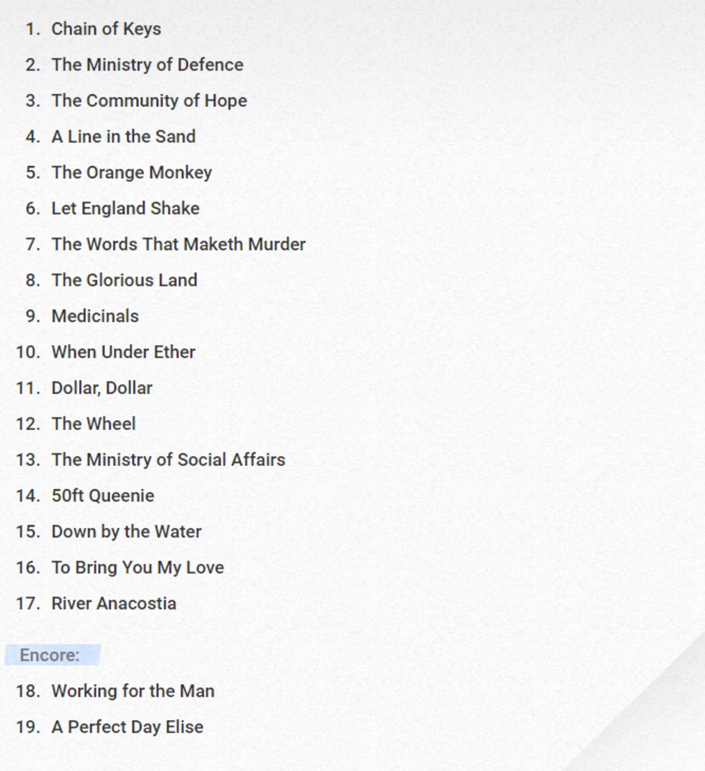 Όταν έφτασε η ώρα για τα αγαπημένα μου 90’s anthems, είχα ήδη χάσει τη (στενή τρίτου τύπου) επαφή μου με το live και οι προσδοκίες μου είχαν εξανεμιστεί. 50ft Quennie απ το Rid Of Me, Down By The Water και To Bring You My Love - η κορυφαία στιγμή της συναυλίας με διαφορά. Μόνο σε αυτό το κομμάτι ένιωσα για τα καλά τη μουσική φρενίτιδα και μεγαλοφύια που κουβαλάει στα σωθικά της όλα αυτά τα χρόνια η αγαπημένη μου Polly. Κι εκεί συνειδητοποίησα, υπό τον ήχο της ηλεκτρικής κιθάρας που την συνόδευε μόνη της για πρώτη φορά σε όλο το live, πόσο με είχαν κουράσει τα πνευστά την προηγούμενη μία και βάλε ώρα. Το πολύ το Κύριε ελέησον, το βαριέται κι ο παπάς... Το live έκλεισε με το River Anacostia και στο encore προσπαθήσαμε να απογειωθούμε με τα εκπληκτικά Working For The Man και A Perfect Day Elise. Εγώ προσωπικά δεν μπόρεσα, διότι εντέλει ποτέ δεν κατάφερα να μπω για τα καλά στο κλίμα του live. Μπορεί να ήταν και δικό μου πρόβλημα... :) Η τύπου έντεχνη πλευρά της PJ δεν είναι τελικά my cup of tea, αυτό είναι όλο.