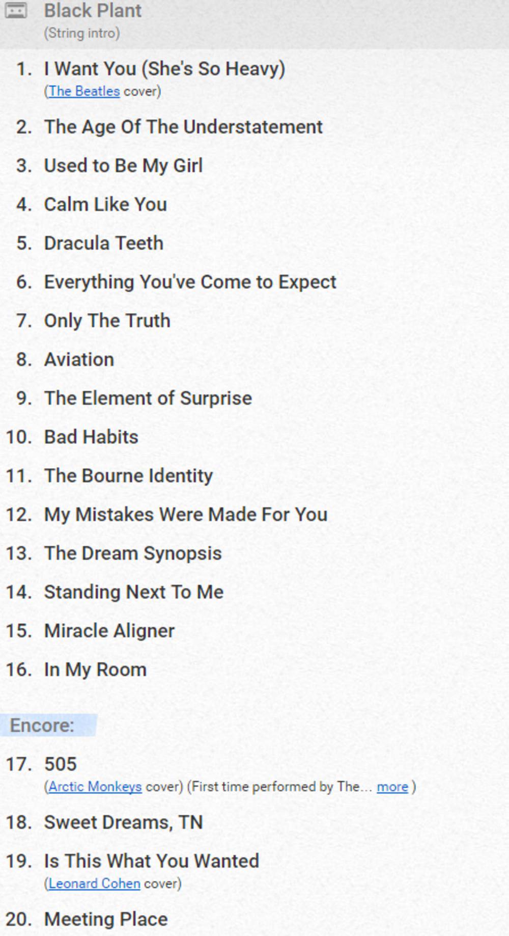 Μετά από περίπου μιάμιση ώρα μας χαιρέτησαν κι επέστρεψαν για το καθιερωμένο encore. Κι εδώ ζήσαμε κάτι μοναδικό όσοι βρεθήκαμε στη Μαλακάσα την 5η Ιουνίου: Οι Last Shadow Puppets έπαιξαν για πρώτη φορά στην ιστορία τους το 505 των Monkeys. Έχει συμβεί πολλές φορές ο Miles να ανεβαίνει σε live των Μαϊμούδων για να το πει μαζί τους, αλλά σαν TLSP αυτό συνέβη για πρώτη φορά κι αυτό δείχνει πόσο γουστάρανε το συγκεκριμένο live ο Turner και ο Kane. Και μεις γουστάραμε βέβαια σαν τρελοί, κι έτσι -με αυτήν την αμοιβαία αγάπη και ωραία ατμόσφαιρα- τέλειωσε ένα από τα καλυτερα live των τελευταίων χρόνων στη χώρα μας. ΕΠΟΣ...