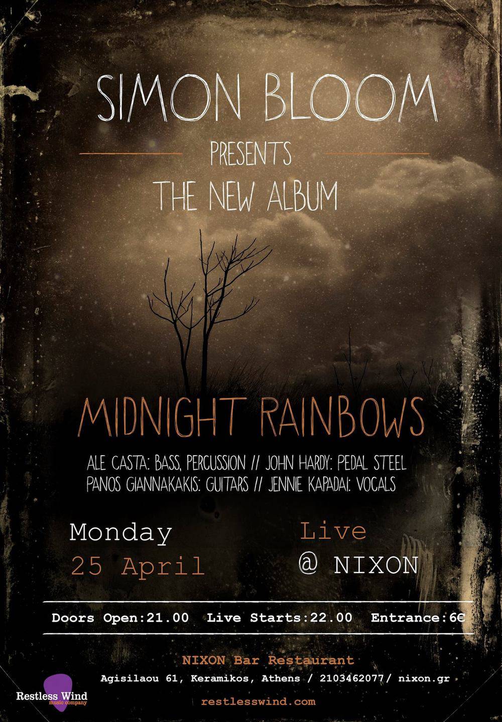 Ο τραγουδοποιός Simon Bloom μαζί με την ανανεωμένη μπάντα του, επιστρέφει μετά από χρόνια στις ζωντανές εμφανίσεις, παρουσιάζοντας το νέο του τέταρτο στη σειρά άλμπουμ Midnight Rainbows τη Δευτέρα 25 Απριλίου στο Nixon ( Αγησιλάου 61, Κεραμεικός).