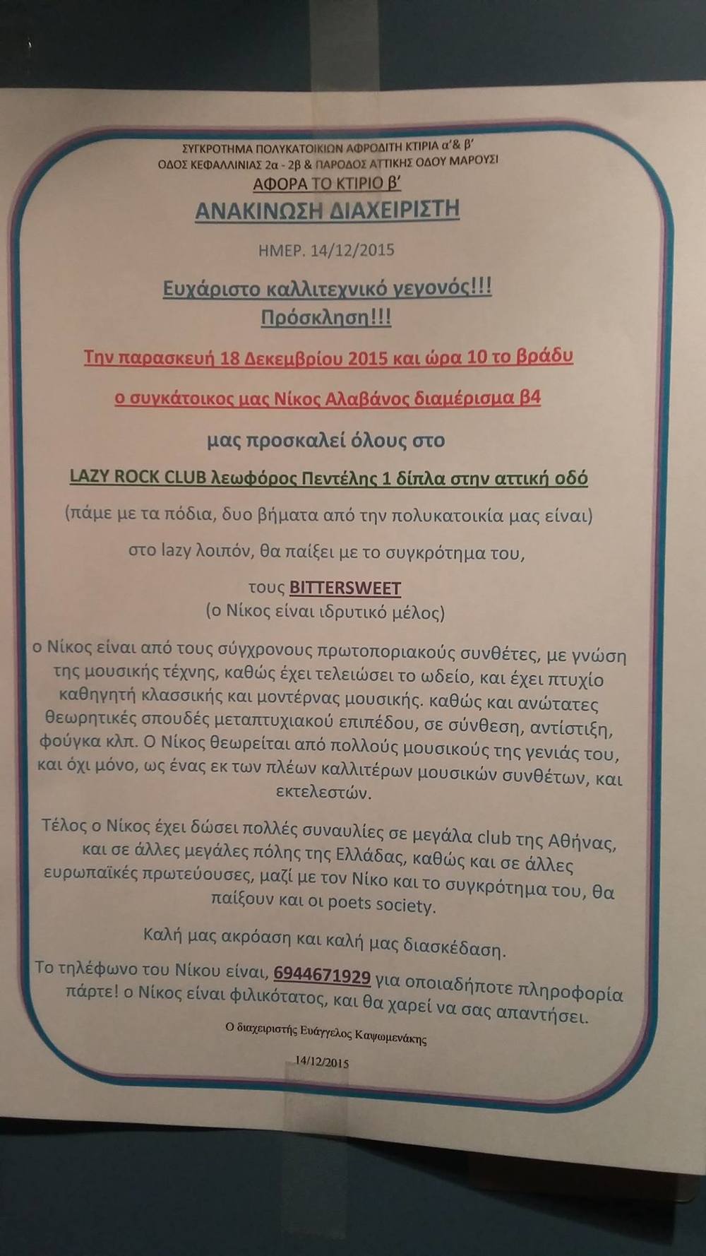 Οι αγαπημένοι του Υπογείου BitterSweet του Νικόλα Αλαβάνου αποχαιρετούν το 2015 μ'ένα live στο Lazy Club (Λ.Πεντέλης 1, Βριλήσσια - είσοδος 8 ευρώ με μπυρίτσα). Η φωτό παραπάνω νομίζω σας εξηγεί γλαφυρότατα τους λόγους που πρέπει να πάτε εκεί... :) Και πέρα από αυτό, μιλάμε για μια μπάντα με μια δισκάρα στις πλάτες της, το Dancing In The Zoo (2012) και άλλη μία, είμεθα βέβαιοι εξίσου καλή, on its way, μεγάλο μέρος της οποίας θα έχουμε την ευκαιρία να ακούσουμε απόψε. Φήμες λένε πως ο frontman Νικόλας θα φοράει τα γυαλιά ηλίου μου κατά τη διάρκεια του live (κι αυτός είναι φυσικά ένας ακόμα λόγος για να παραστείτε στο live). Τη συναυλία θα ανοίξουν οι Dead Poets Society.