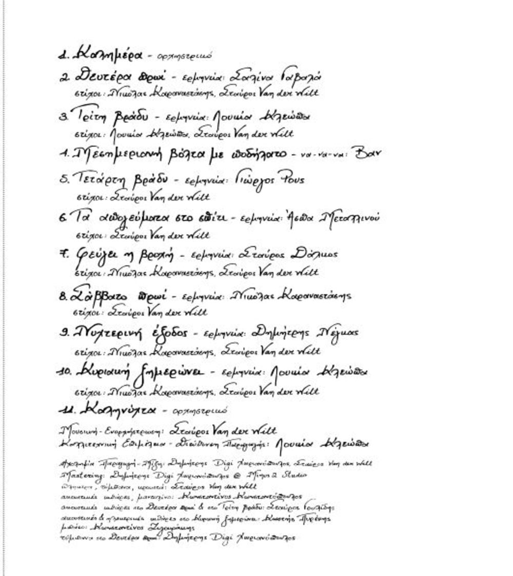 O Stavros Van Der Wilt είναι ένας 42χρονος μουσικός απύθμενου ταλέντου, πληκτράς, συνθέτης, στιχουργός και ενορχηστρωτής. Τον παρακολοθούμε από την... εφηβεία του, μιας και μεγαλώσαμε στις ίδιες γειτονιές, ήπιαμε τις πρώτες μας μπίρες στις ίδιες καφετέριες και στα ίδια μπαρ, σπάσαμε το κεφάλι μας για να βρούμε το νόημα της ζωής και του έρωτα στους ίδιους τοίχους, περπατήσαμε τραγουδώντας Μπακιρτζή και Χειμερινούς Κολυμβητές στους ίδιους δρόμους... Τα χρόνια πέρασαν, όχι θα κάθονταν και θα περίμεναν, το νόημα της ζωής και του έρωτα ακόμα αναζητείται, ο καθένας από εκείνη τη γειτονιά πήρε τον δικό του δρόμο, όμως η μοίρα φέρνει κοντά ξανά κάποιους ανθρώπους, που ξέρεις πως δεν τους έχασες ποτέ...