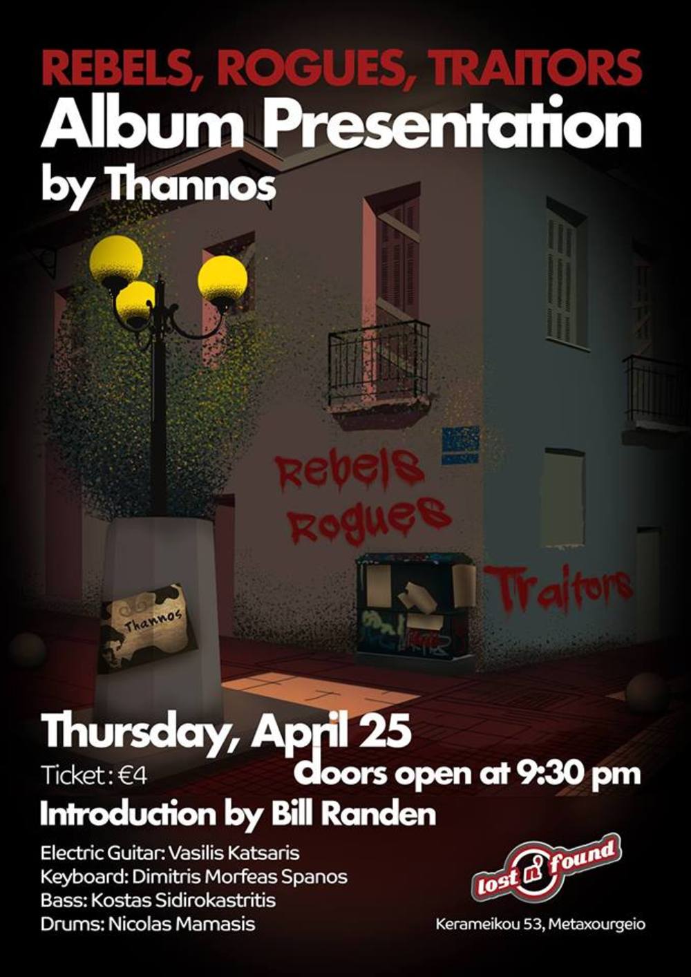 "Rebels, Rogues, Traitors". Ένας δίσκος από τον Thannos. O Θάνος μεγάλωσε στην Αθήνα και μεγαλώνοντας ταξίδεψε, μάζεψε εμπειρίες, εικόνες, ήχους και γύρισε πίσω σε αυτή την «ρουφήχτρα» πόλη αποφασισμένος να μας μυήσει στην μουσική του. Λένε ότι ο μόνος δρόμος αν θέλεις να πετύχεις είναι η ανηφόρα και αυτό μάλλον πιστεύει και ο ίδιος, αφού ήρθε σε μια πόλη, ή καλύτερα χώρα, που δεν έχει και τόσο μεγάλο κοινό γύρω από το είδος του. Το "Rebels, Rogues, Traitors" είναι κατά βάση ένας folk δίσκος. Βέβαια αν παρατηρήσεις τις μελωδίες λίγο παραπάνω, θα διακρίνεις και άλλα είδη να εμφανίζονται στις μελωδίες του. Όταν έσκασε το μήνυμα με τις πληροφορίες και το link για να ακούσω τον δίσκο, δεν είχα ιδέα τι θα ακούσω. Πάτησα play και για τρία λεπτά άκουγα δυο γυναίκες να μιλάνε, μου φάνηκε περίεργο και ταυτόχρονα ενδιαφέρον αυτό το ξεκίνημα του άλμπουμ. Όταν ξεκίνησα να γράφω αυτό το review, έστειλα ένα μήνυμα στο Θάνο που τον ρωτούσα αν αυτό είναι δικό του ή αν είναι από κάποια ταινία. Η απάντηση που πήρα ήταν ότι είναι ένας αυτοσχεδιασμός από δυο μεθυσμένες φίλες του. Οκ μετά από αυτό έδωσα περισσότερη βάση στο τι έλεγαν και είπαν τόσα πολλά, η ανάλυση για τα "ξεκινήματα" πρέπει να πω ότι ήταν σαν να βγαίνουν τα λόγια από μέσα μου...