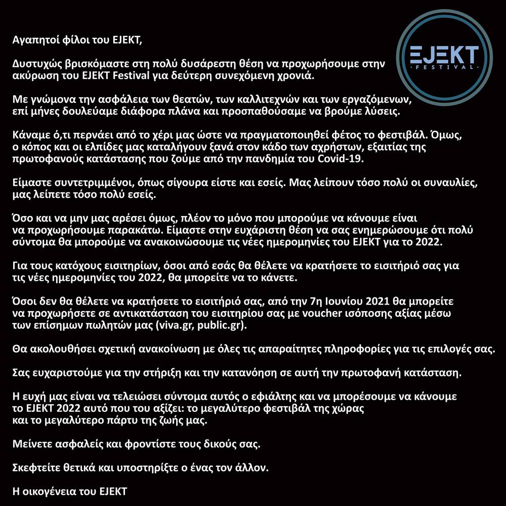 Το EJEKT FESTIVAL ανακοίνωσε προ ολίγου την ακύρωση του (και) για το 2021.