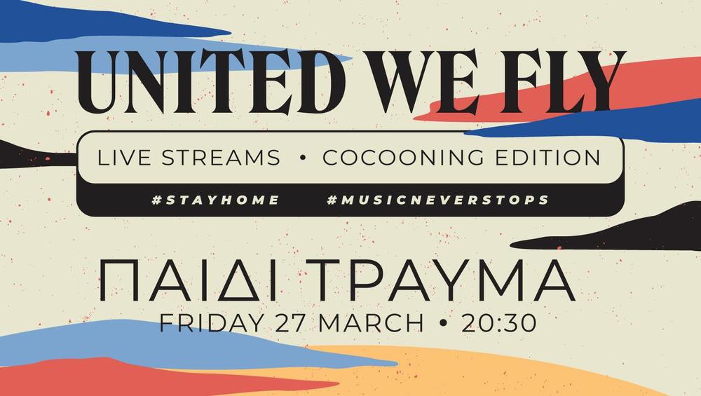 Πριν λίγες μέρες σας γράφαμε (check here) ότι η United We Fly ετοιμάζεται για τις πρώτες διαδικτυακές συναυλίες. Απο χθές είναι πραγματικότητα. Την αρχή έκανε χθες το βράδυ η Ειρηνή Σκυλακάκη και σήμερα παίρνει την σκυτάλη ο αγαπημένος Παιδί Τραύμα. Το ραντεβού είναι στις 20:30. Φορέστε τα καλά σας για μισή ώρα σα να πηγαίναμε σε live και ας αφήσουμε το Παιδί Τραύμα να μας διδάξει πάλαιες αλλά και νέες μυστικές μουσικές κινήσεις. Δεν υπάρχει αντιτίμο για να παρακολουθήσουμε τη "συναυλία" αλλά όποιος θέλει και μπορεί να στηρίξει το όλο εγχείρημα μπορεί να κάνει μια δωρέα με ότι ποσό αυτός θέλει μέσω της viva εδώ. Για να μη ξεχαστείτε και χάσετε το live καντε subscribe στο κανάλι της United We Fly στο youtube. Για τo link της συναυλίας πατήστε εδώ.