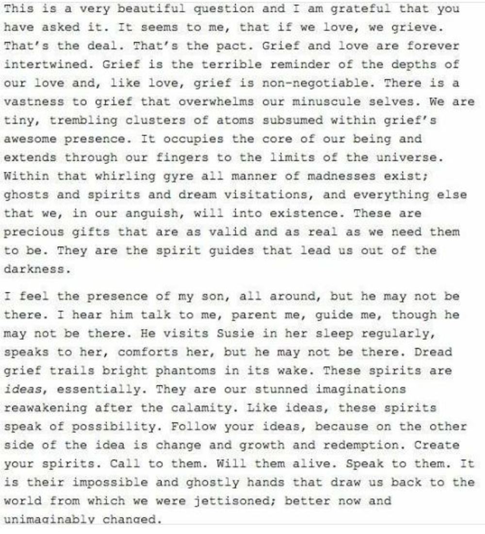 Αυτή είναι μια πολύ όμορφη ερώτηση και χαίρομαι που μου την έκανες. Μου φαίνεται ότι, αν αγαπάμε, θρηνούμε. Έτσι είναι. Αυτή είναι η συμφωνία. Η θλίψη και η αγάπη είναι πάντα συνυφασμένες. Η θλίψη είναι η τρομερή υπενθύμιση του βάθους της αγάπης μας και, όπως και η αγάπη, η θλίψη δεν είναι διαπραγματεύσιμη. Υπάρχει μια απεραντοσύνη στη θλίψη που κατακλύζει τους μικροσκοπικούς εαυτούς μας.
