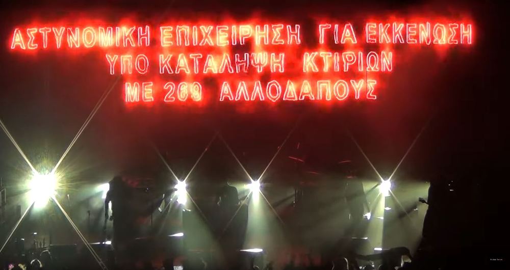 Φτάνοντας στο σήμερα, το μήνυμα στα video wall αρχικά αναφέρθηκε στις εκκαθαριστικές επιχειρήσεις της αστυνομίας στα Εξάρχεια. Στην περίφημη 'ηλεκτρική σκούπα' του αντιπροέδρου της Πανελλήνιας Ομοσπονδίας Αστυνομικών Υπαλλήλων, Σταύρου Μπαλάσκα, της σκούπας που θα ρουφήξει την 'ανθρώπινη σκόνη' και τα 'ανθρώπινα σκουπίδια': "Αστυνομική επιχείρηση για εκκένωση υπό κατάληψη κτιρίων με 269 αλλοδαπούς".